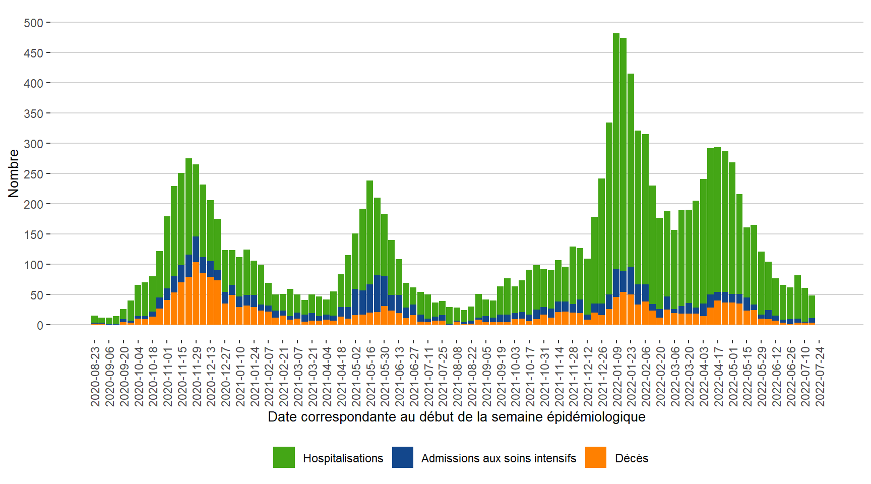 Figure 8. Résultats graves de COVID-19 par semaine de date des résultats au Manitoba du 23 août 2020 au 23 juillet 2022
