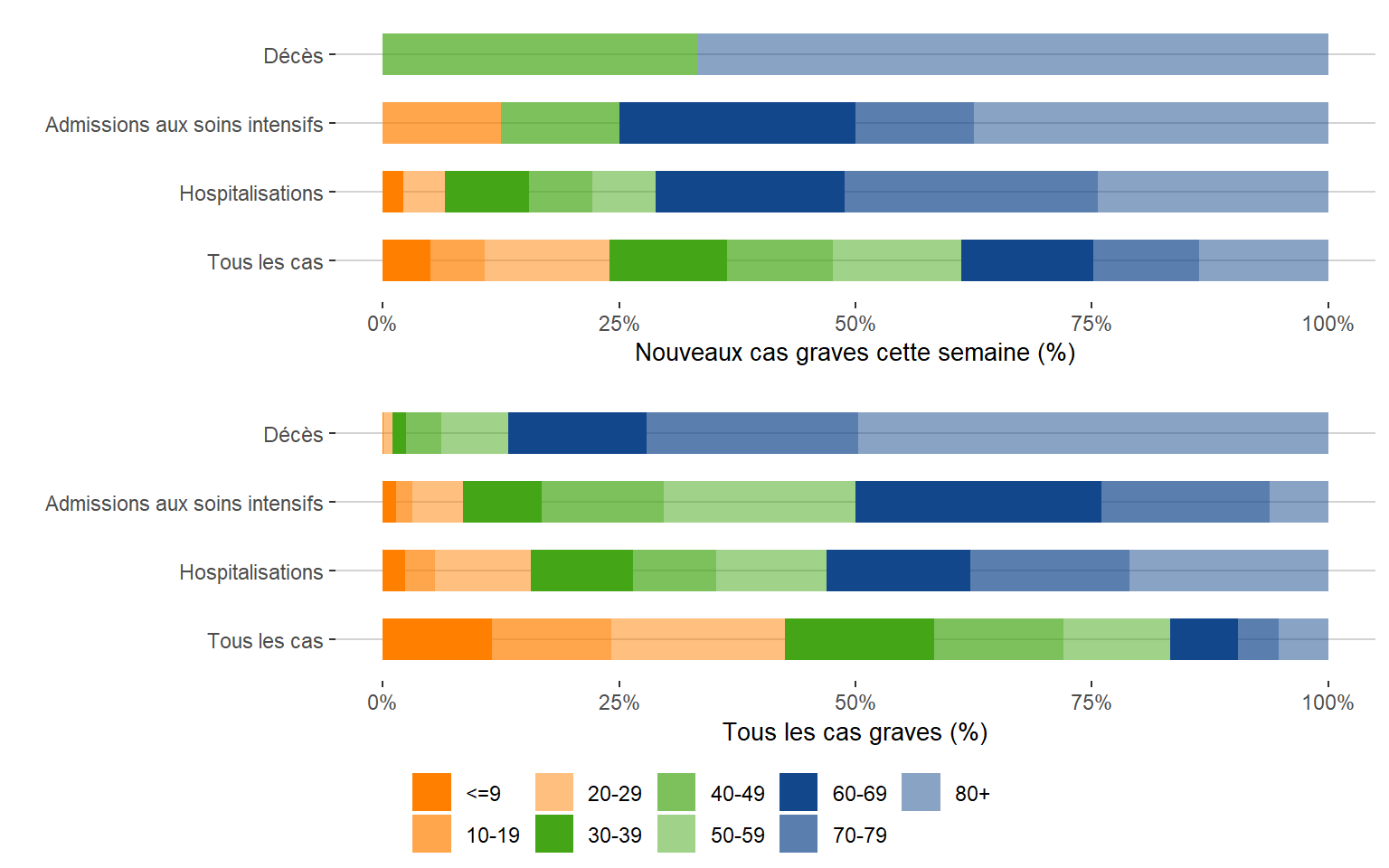 Figure 9. Répartition des cas graves de COVID-19 selon l’âge par rapport à tous les cas au Manitoba du 13 mars 2020 au 23 juillet 2022
