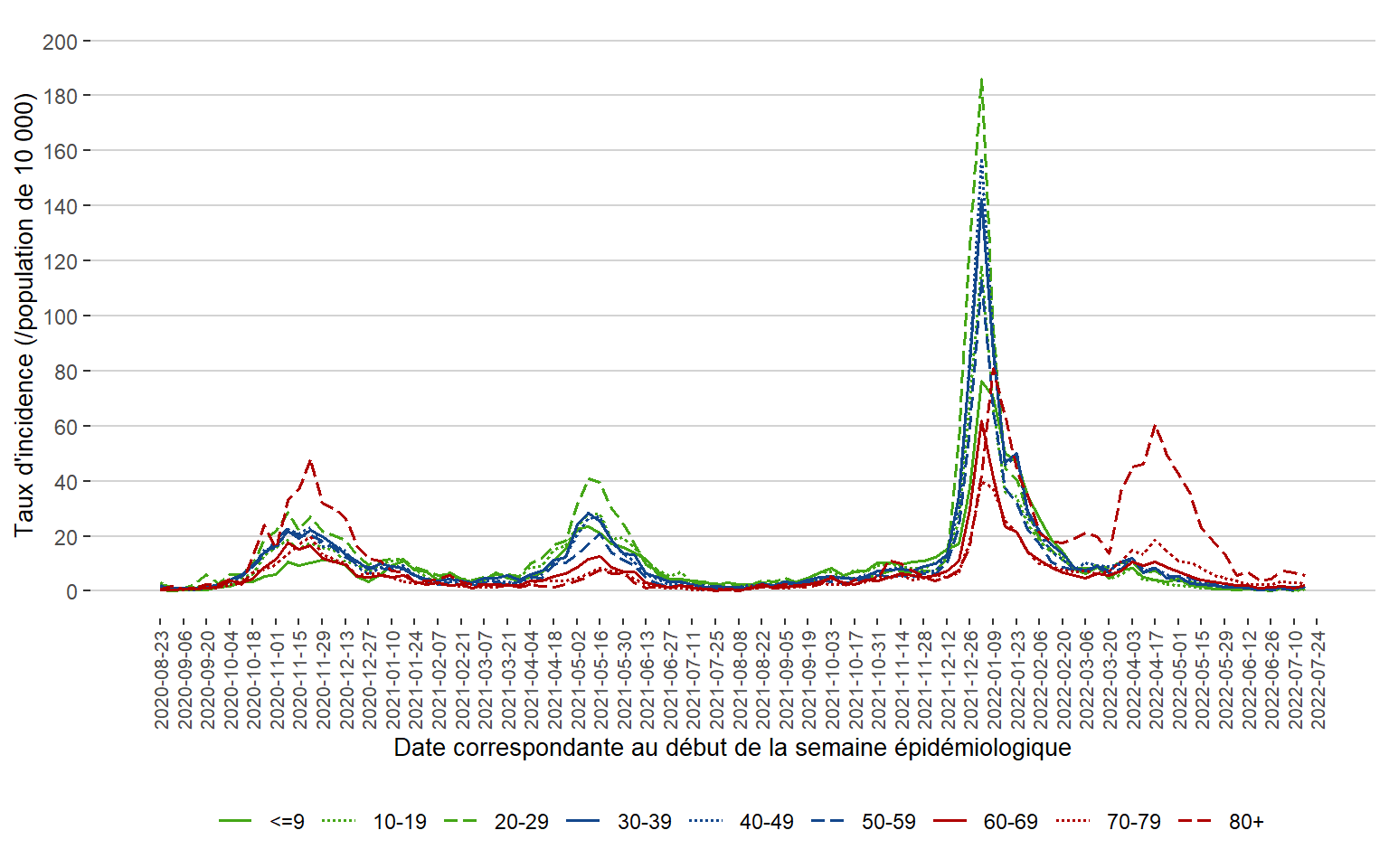 Figure 3. Taux d’incidence (/population de 10 000) des cas de COVID-19 par groupe d’âge et par semaine de date correspondante au rapport de l’office de la santé publique du Manitoba, du 23 août 2020 au 23 juillet 2022