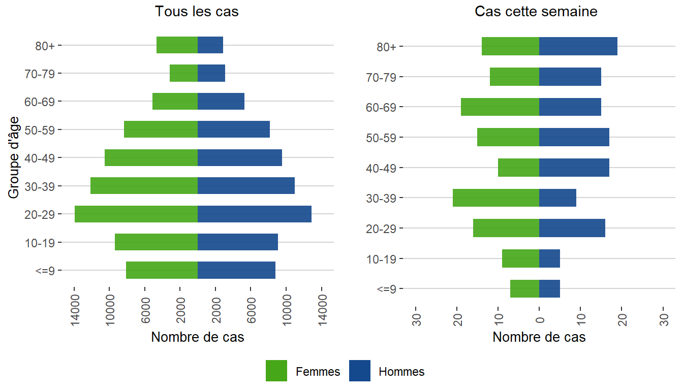 Figure 2. Distributions des cas de COVID-19 par le sexe et l’âge au Manitoba, du 1er mars 2020 au 23 juillet 2022