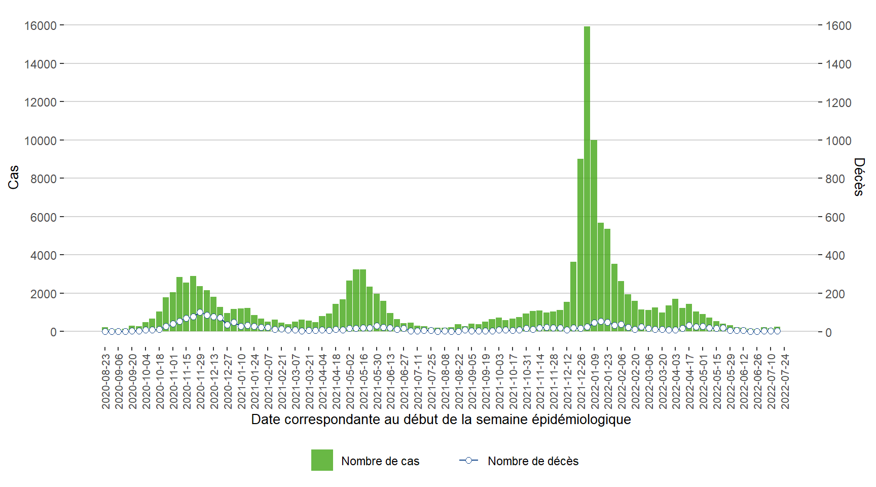 Figure 1. Cas de COVID-19 par semaine correspondante à la date du rapport de l’office de la santé publique du Manitoba du 23 août 2020 au 23 juillet 2022
