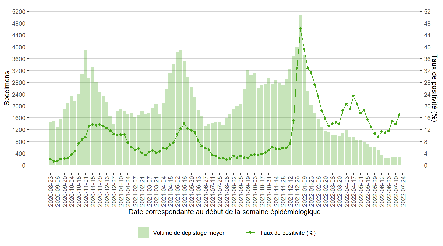 Figure 7. Volume de dépistage quotidien moyen et taux positivité (%) pour la COVID-19 correspondante à la semaine de réception des spécimens au Manitoba du 23 août 2020 au 23 juillet 2022