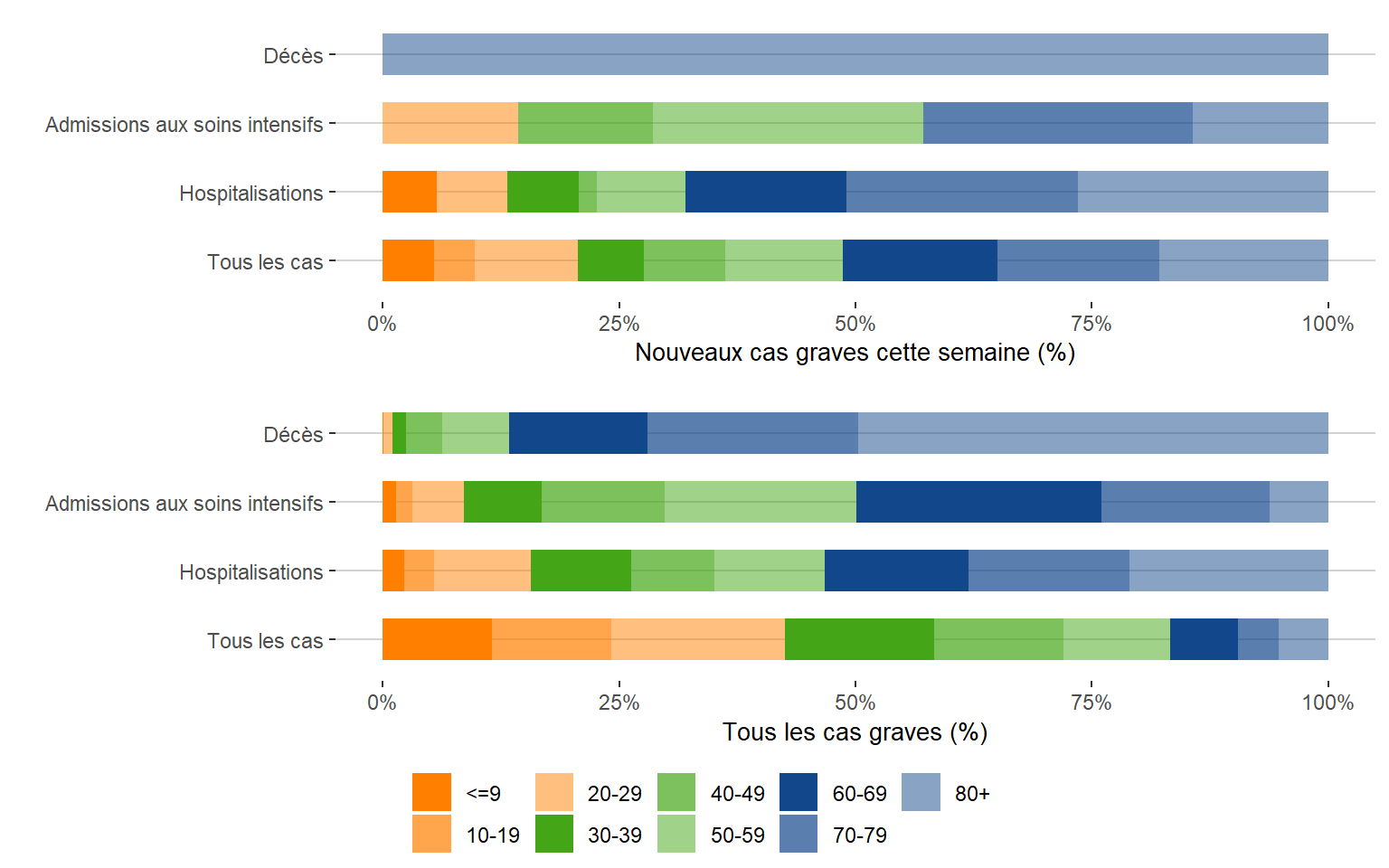 Figure 9. Répartition des cas graves de COVID-19 selon l’âge par rapport à tous les cas au Manitoba du 13 mars 2020 au 30 juillet 2022