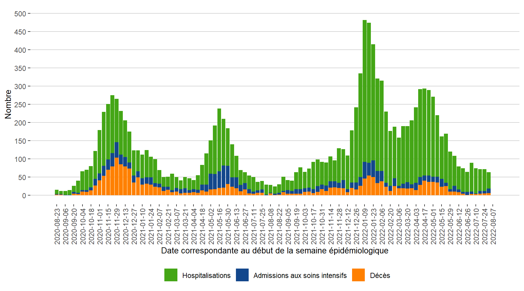 Remarque : Les admissions aux soins intensifs ne sont pas incluses dans les hospitalisations.
