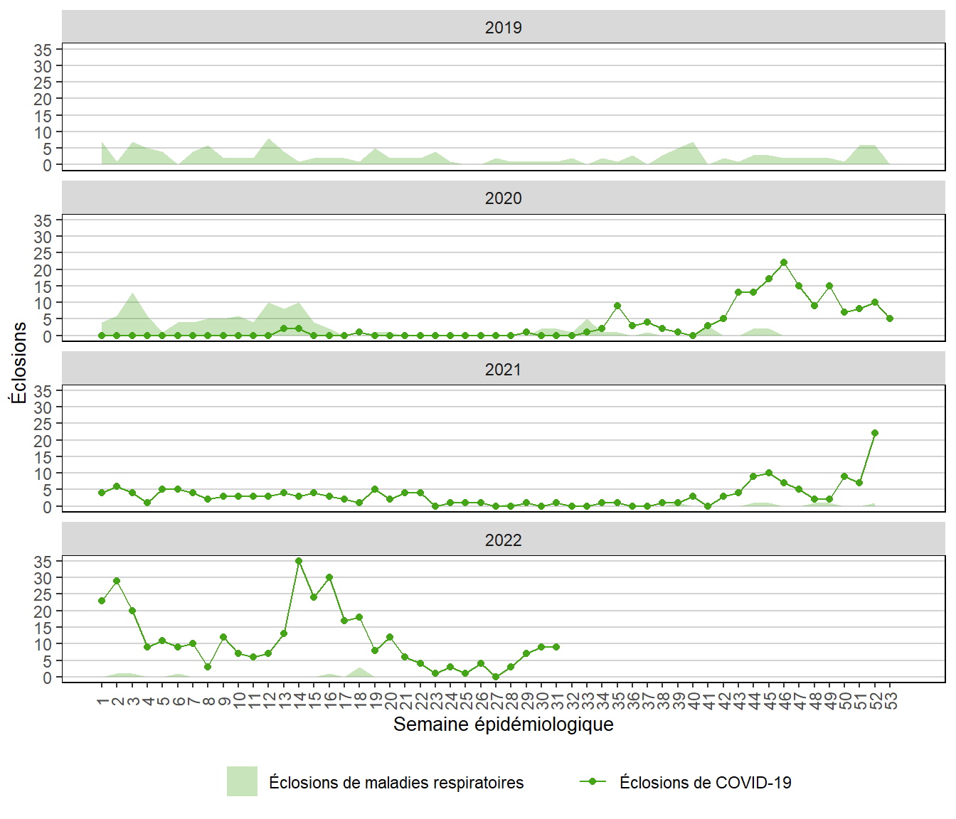 Figure 9. Éclosions de COVID-19 hebdomadaires au Manitoba du 2019 à 2022