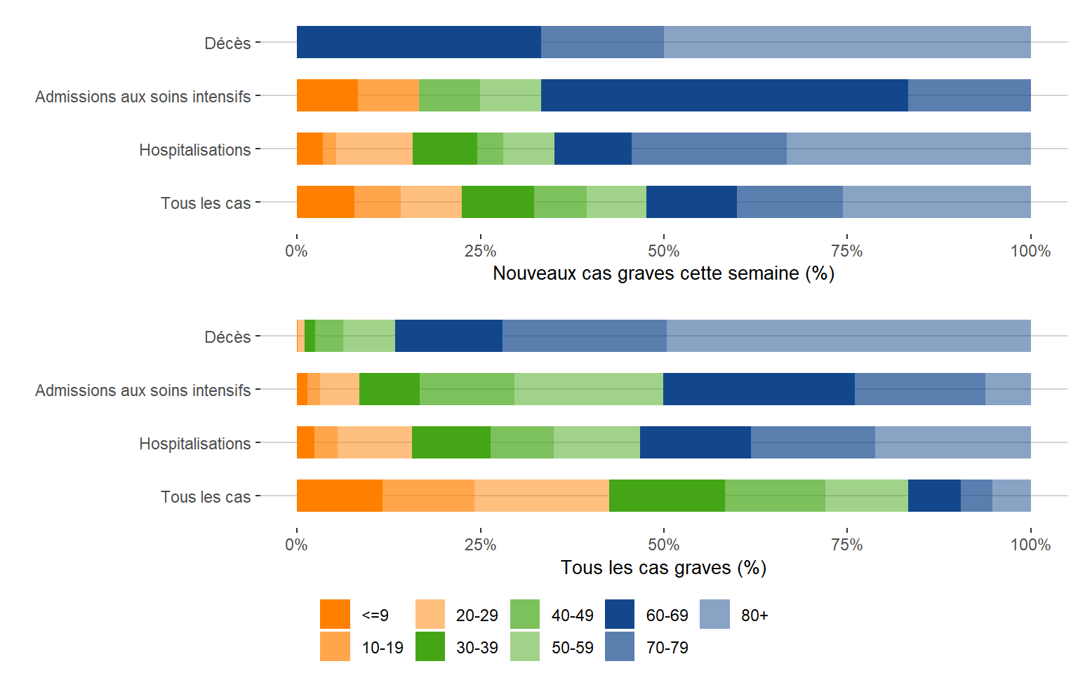 Figure 7. Répartition des cas graves de COVID-19 selon l’âge par rapport à tous les cas au Manitoba du 13 mars 2020 au 6 août 2022