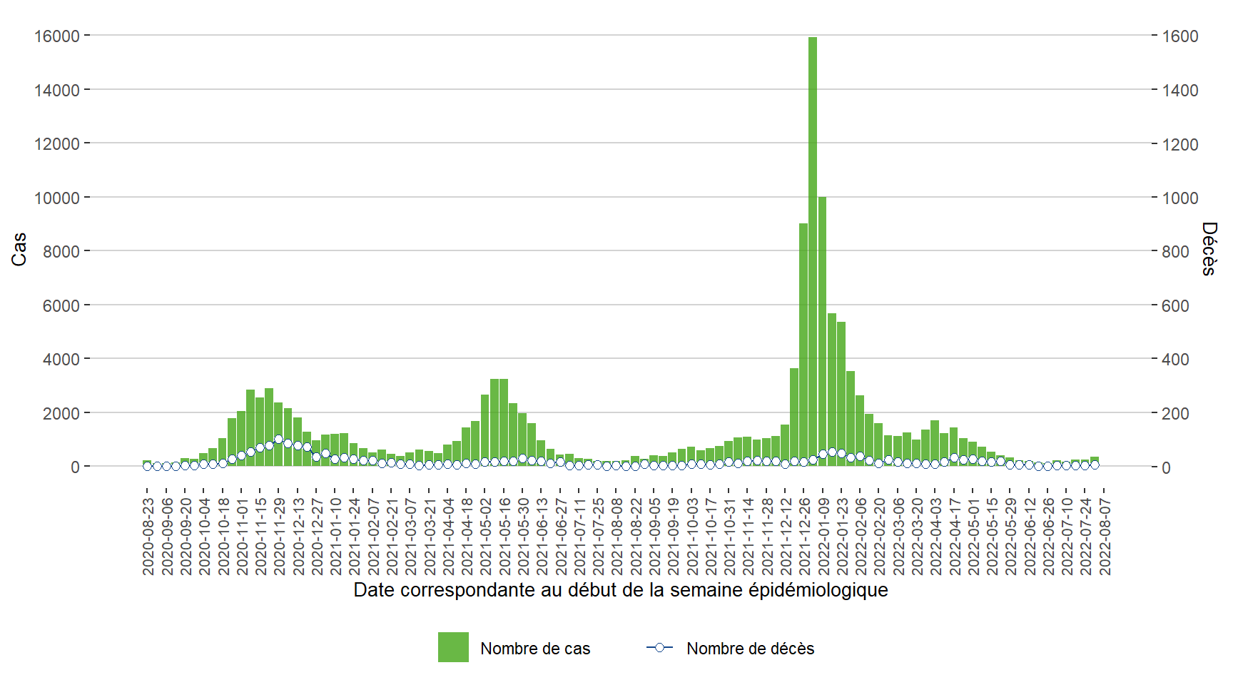 Figure 1. Cas de COVID-19 par semaine correspondante à la date du rapport de l’office de la santé publique du Manitoba du 23 août 2020 au 6 août 2022