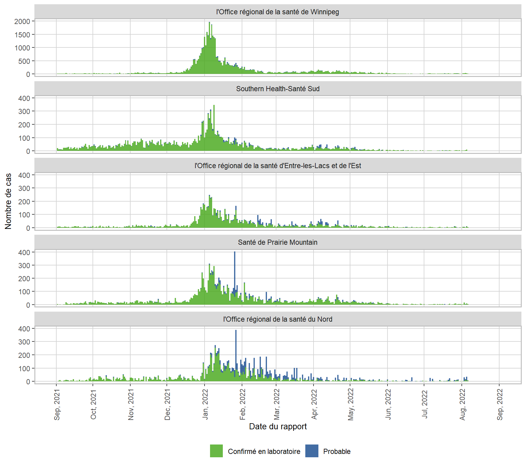 Figure 4. Cas de COVID-19 par ofifice de région de santé et par date du rapport de l’office de la santé publique du Manitoba du 1er septembre 2021 au 6 août 2022