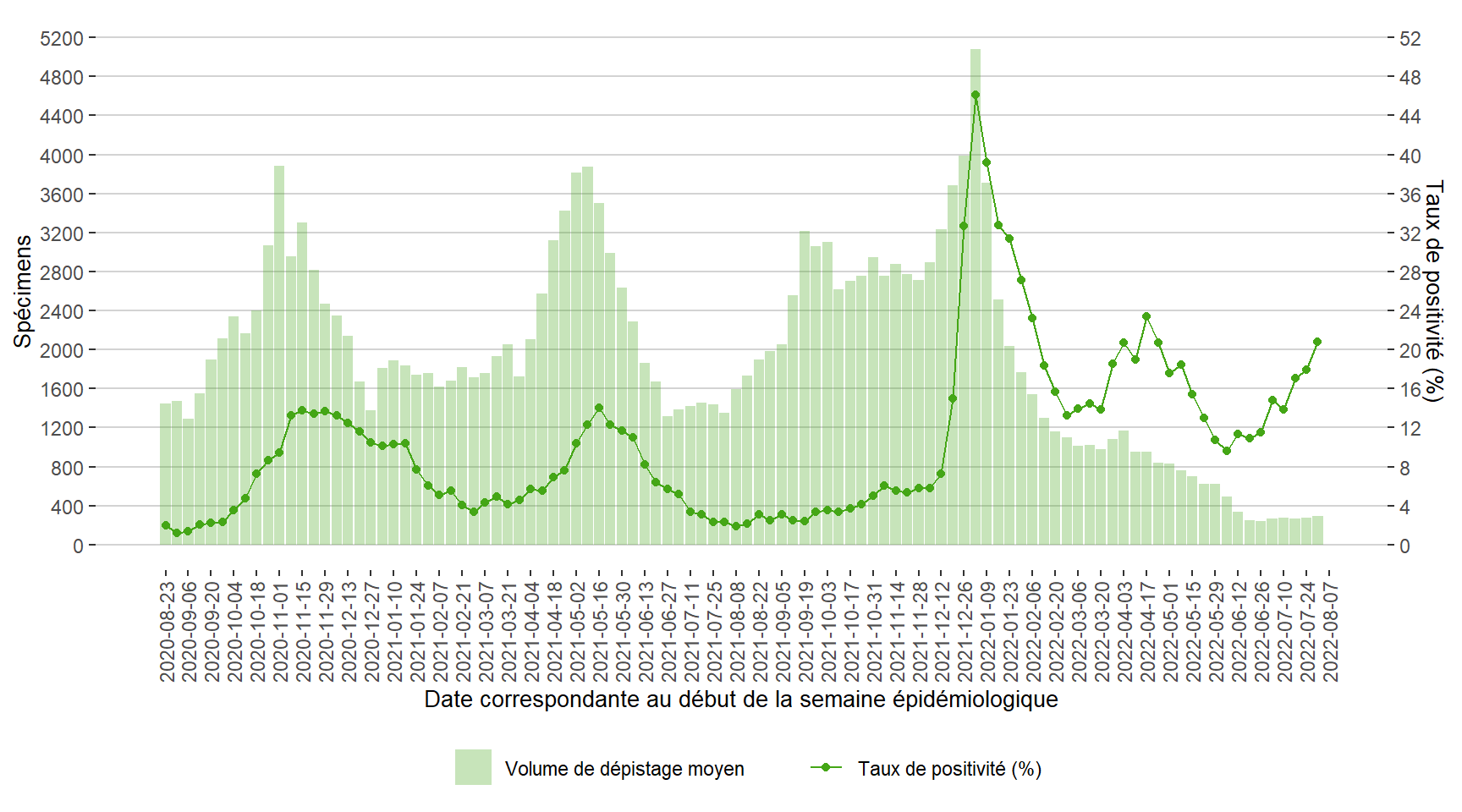 Figure 5. Volume de dépistage quotidien moyen et taux positivité (%) pour la COVID-19 correspondante à la semaine de réception des spécimens au Manitoba du 23 août 2020 au 6 août 2022