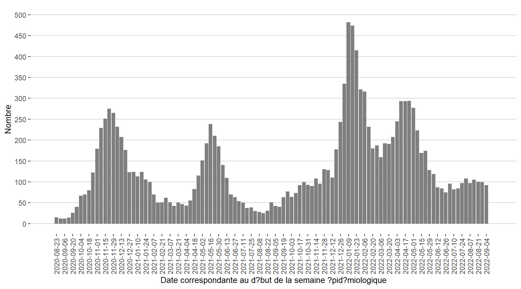 Figure 1. Cas de COVID-19 par semaine correspondante à la date du rapport de l’office de la santé publique du Manitoba du 23 août 2020 au 10 septembre 2022