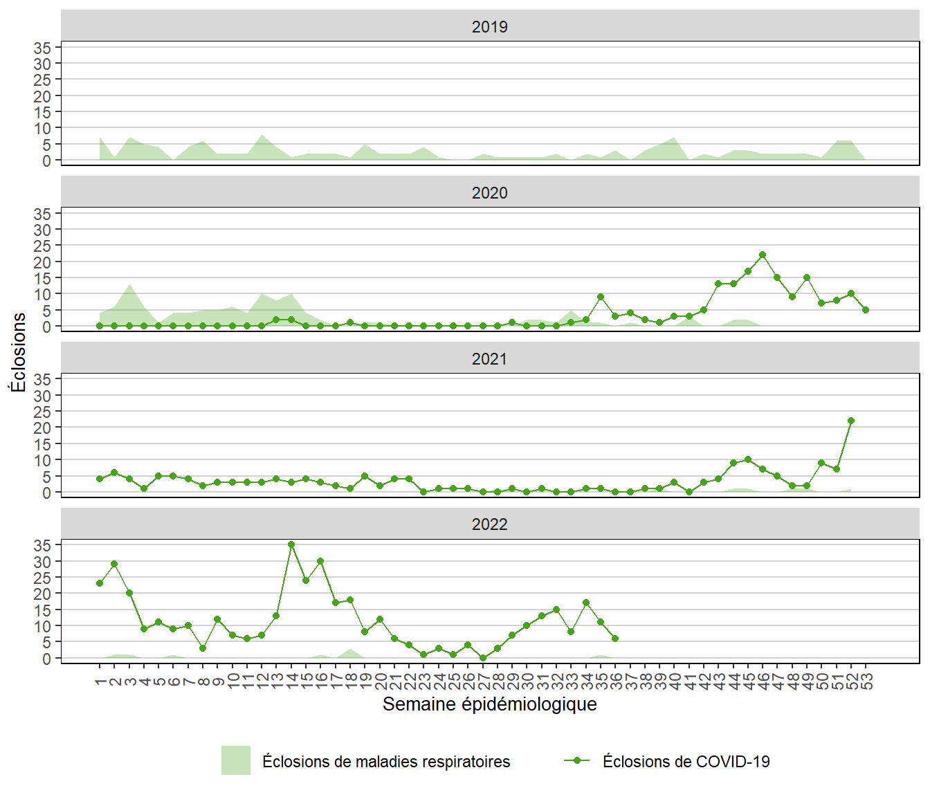 Figure 9. Éclosions de COVID-19 hebdomadaires au Manitoba du 2019 à 2022