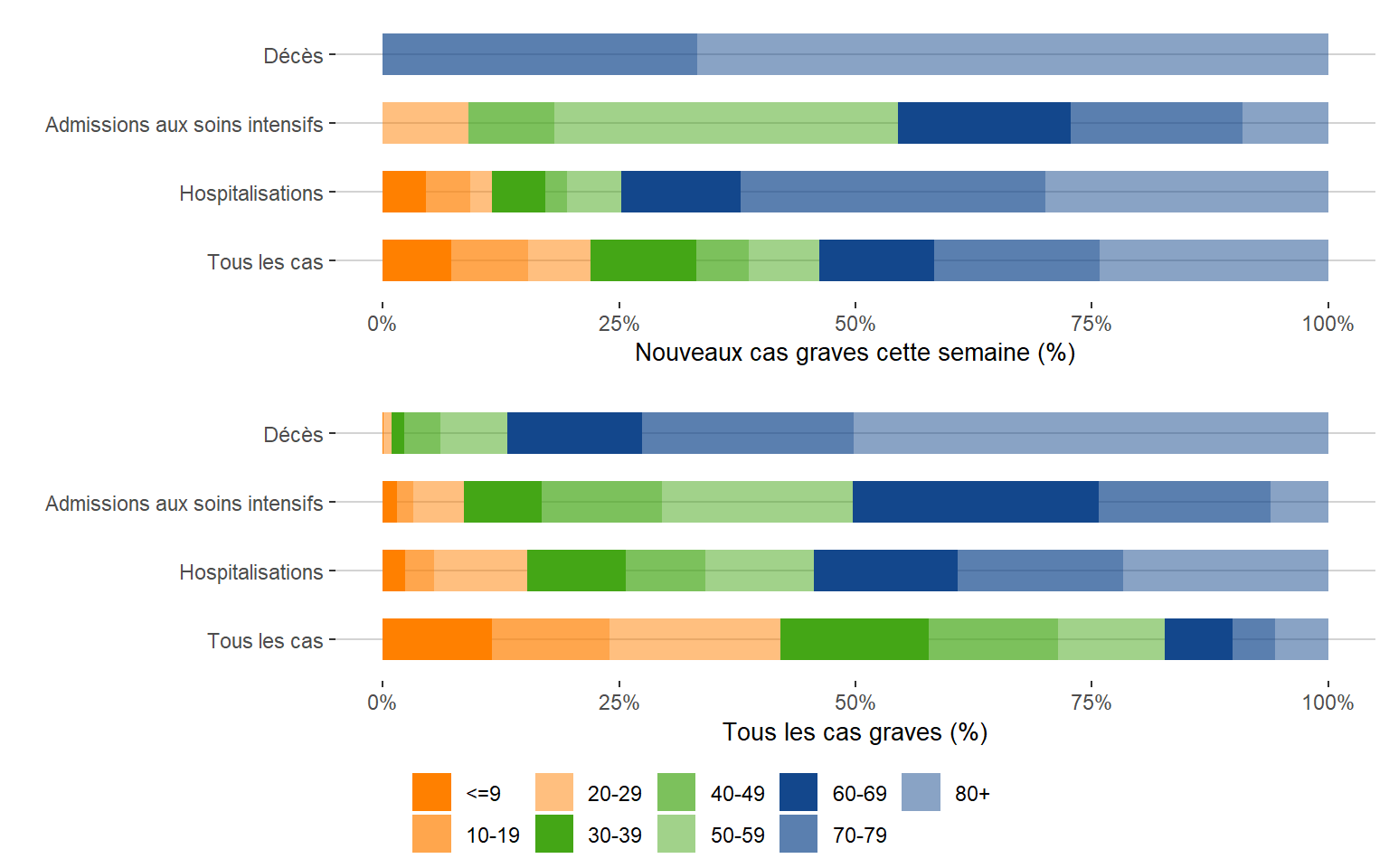 Figure 7. Répartition des cas graves de COVID-19 selon l’âge par rapport à tous les cas au Manitoba du 13 mars 2020 au 10 septembre 2022