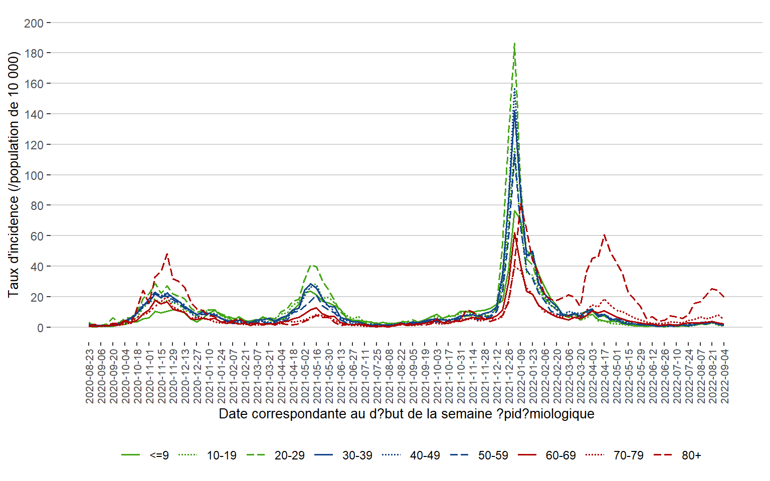 Figure 3. Taux d’incidence (/population de 10 000) des cas de COVID-19 par groupe d’âge et par semaine de date correspondante au rapport de l’office de la santé publique du Manitoba, du 23 août 2020 au 10 septembre 2022
