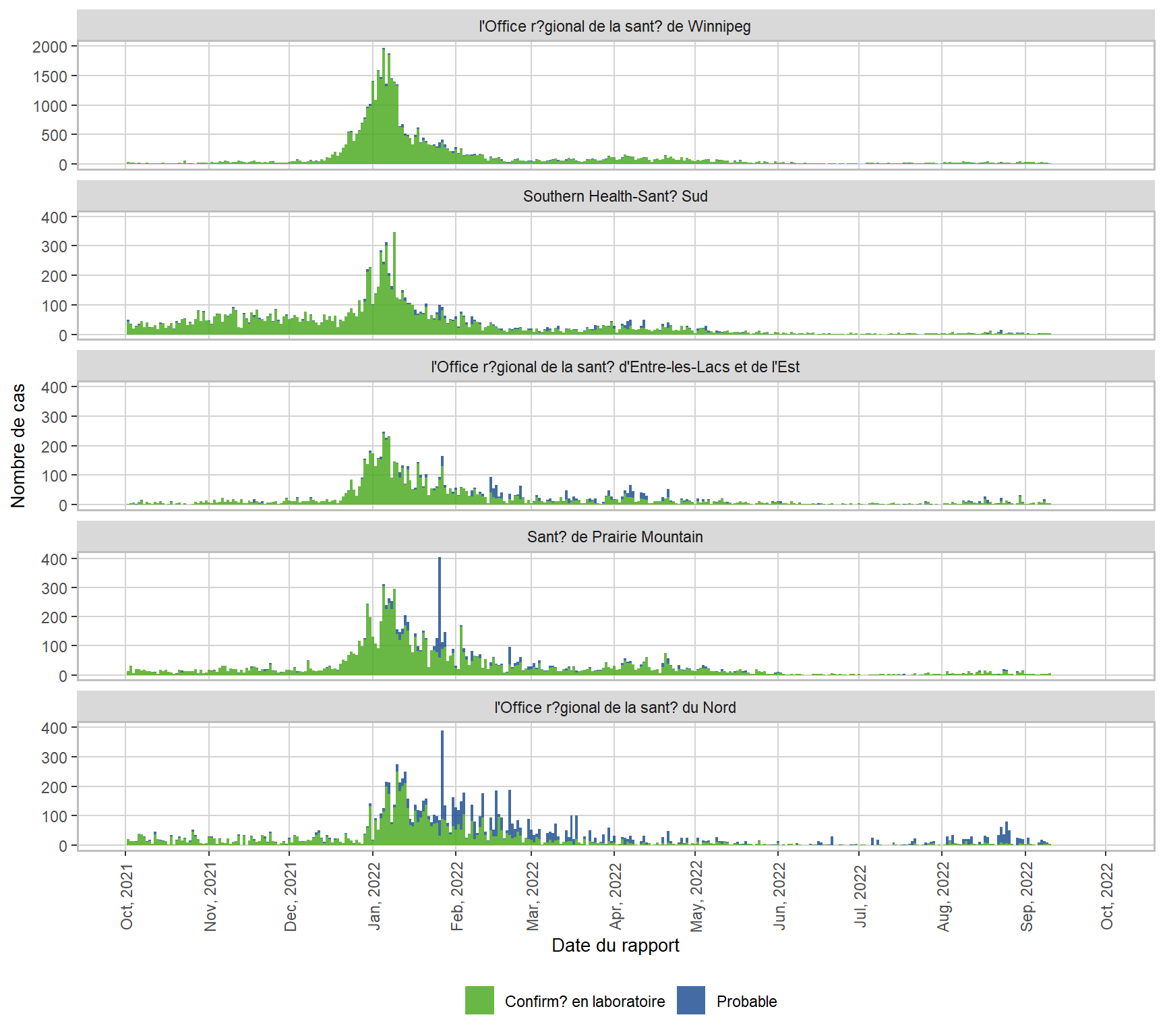 Figure 4. Cas de COVID-19 par ofifice de région de santé et par date du rapport de l’office de la santé publique du Manitoba du 1er octobre 2021 au 10 septembre 2022