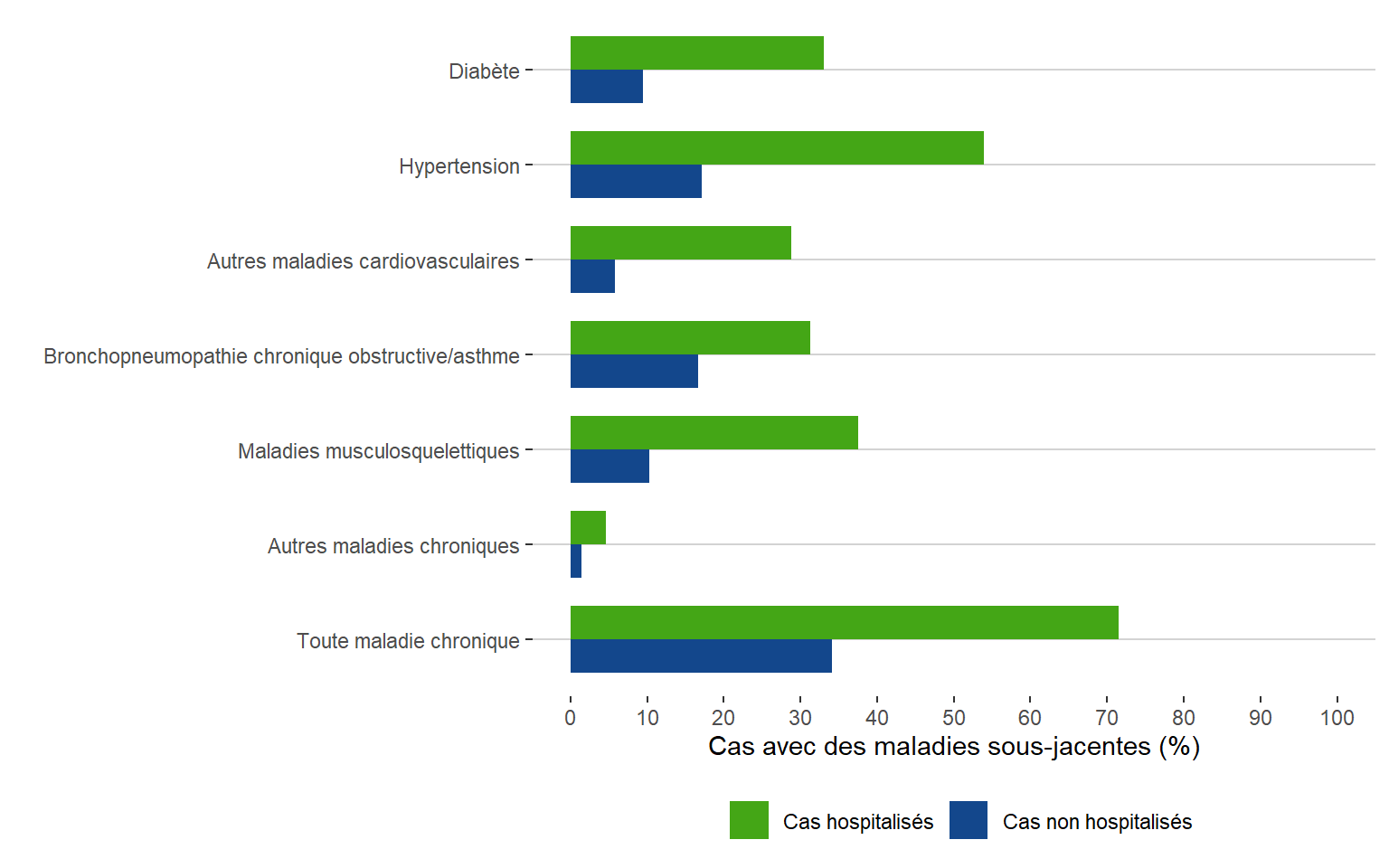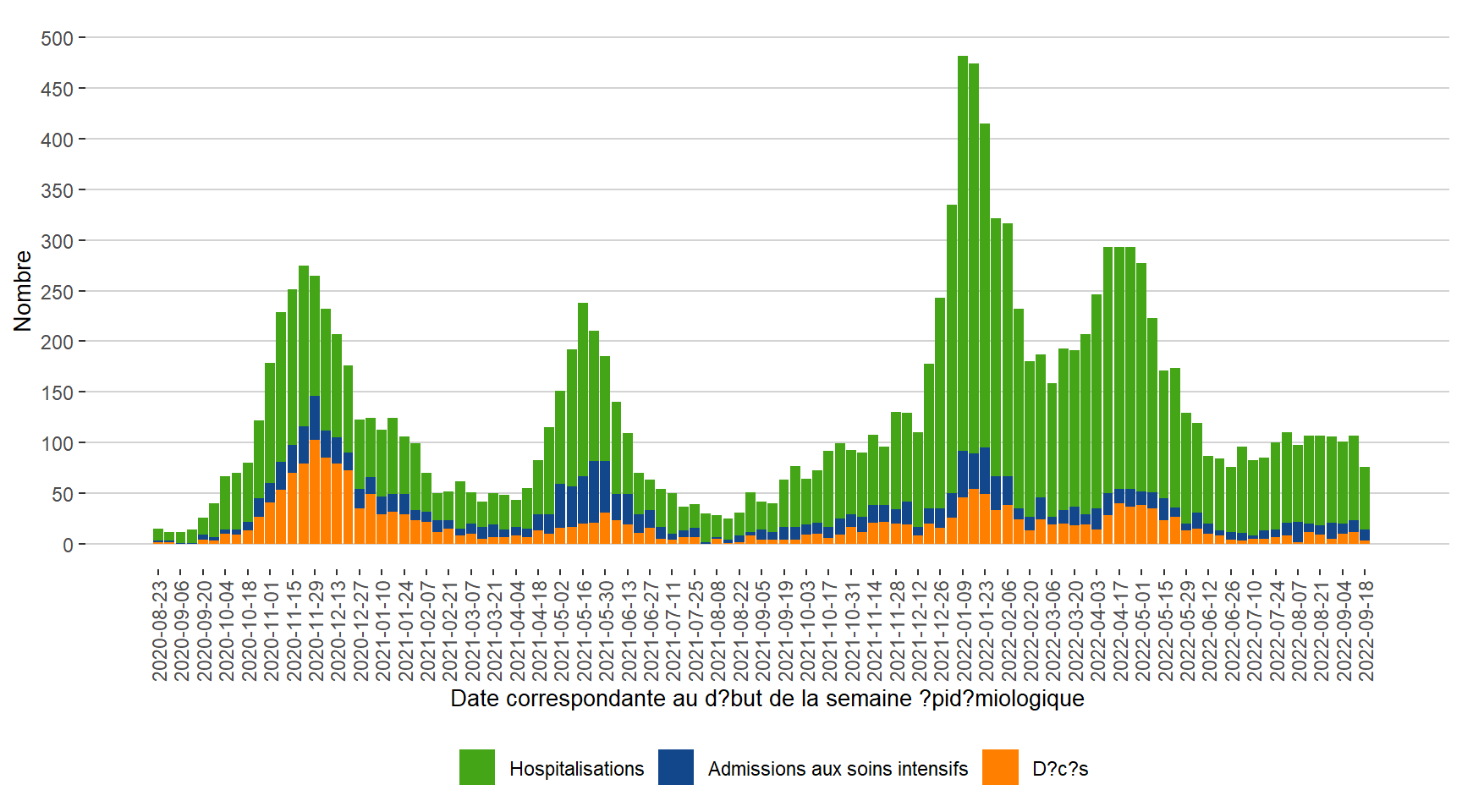 Remarque : Les admissions aux soins intensifs ne sont pas incluses dans les hospitalisations.