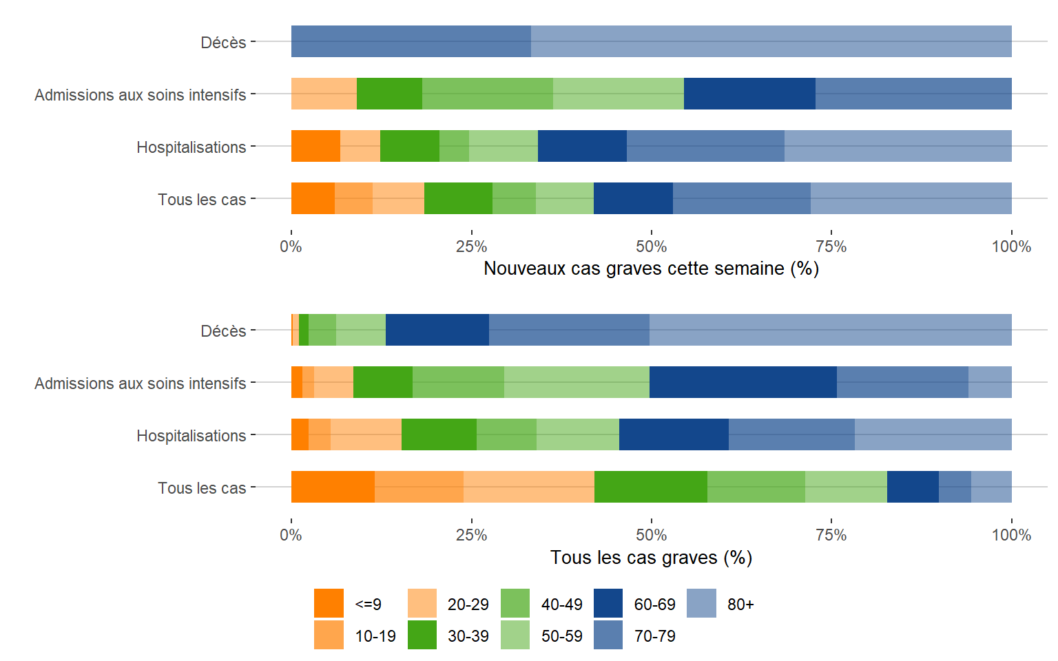 Figure 7. Répartition des cas graves de COVID-19 selon l’âge par rapport à tous les cas au Manitoba du 13 mars 2020 au 24 septembre 2022