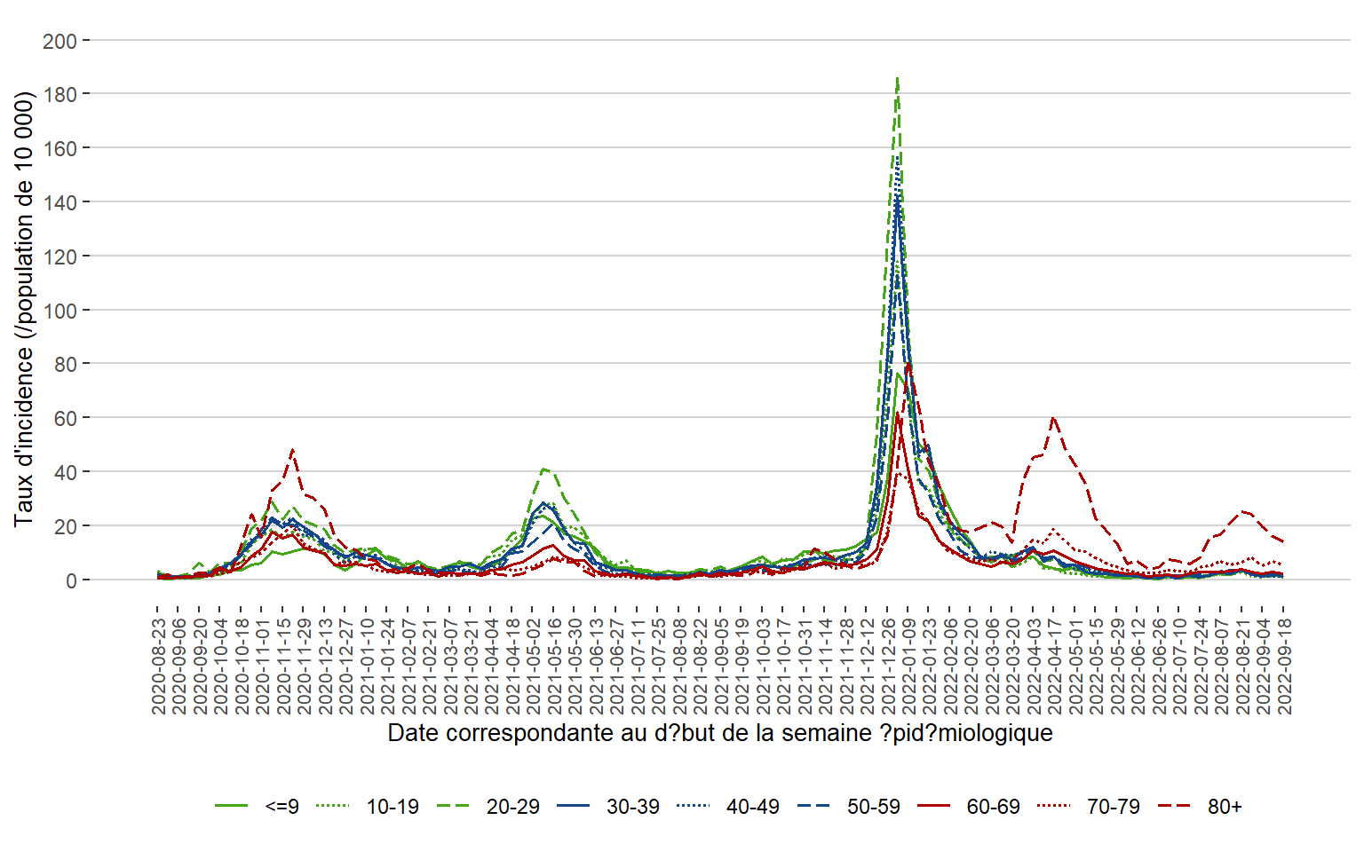 Figure 3. Taux d’incidence (/population de 10 000) des cas de COVID-19 par groupe d’âge et par semaine de date correspondante au rapport de l’office de la santé publique du Manitoba, du 23 août 2020 au 24 septembre 2022