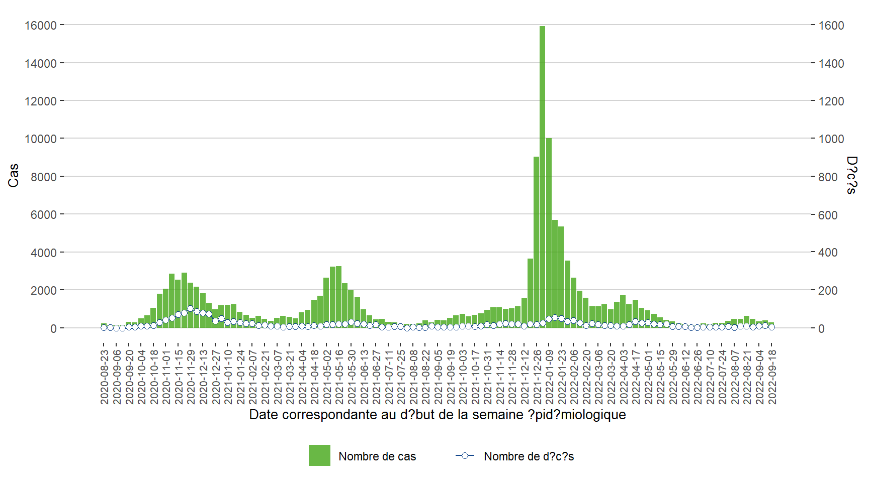 Figure 1. Cas de COVID-19 par semaine correspondante à la date du rapport de l’office de la santé publique du Manitoba du 23 août 2020 au 24 septembre 2022