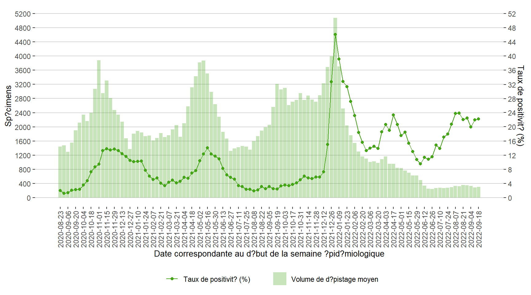 Figure 5. Volume de dépistage quotidien moyen et taux positivité (%) pour la COVID-19 correspondante à la semaine de réception des spécimens au Manitoba du 23 août 2020 au 24 septembre 2022