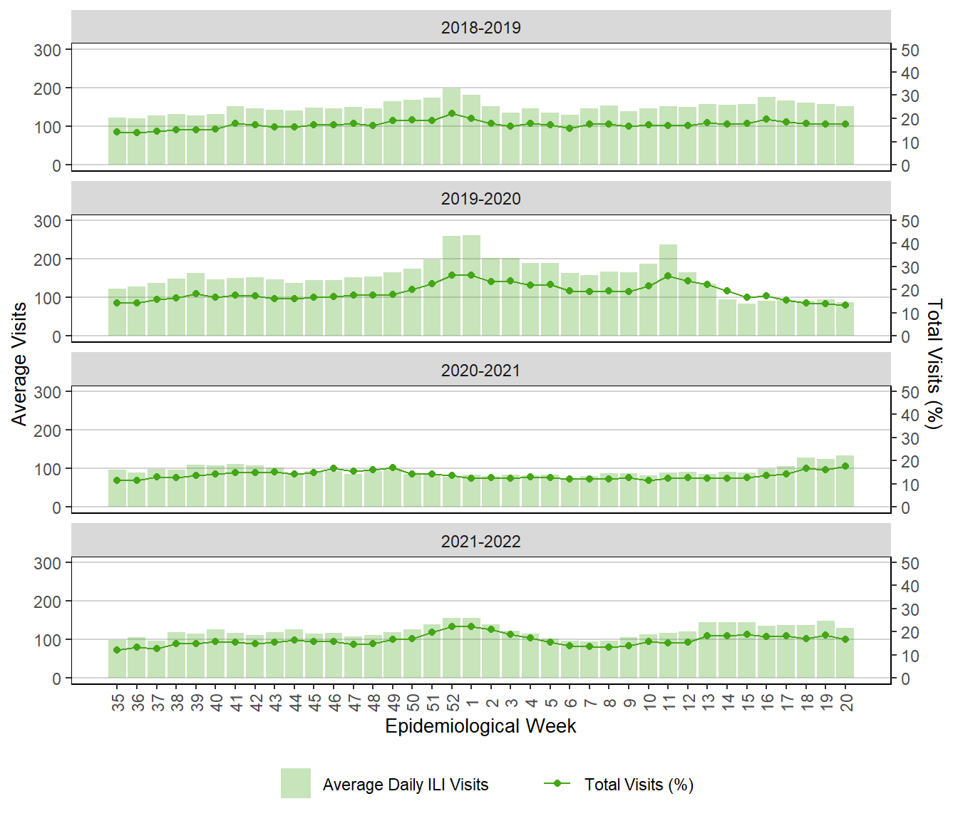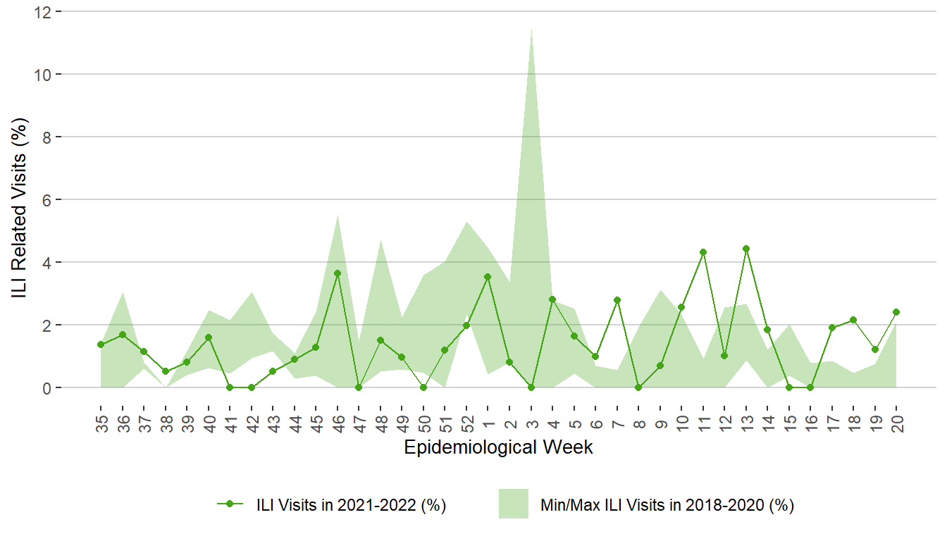Figure 5. Weekly Percentage of ILI Related Visits to Sentinel Physicians, Manitoba, 2018 – May 21, 2022