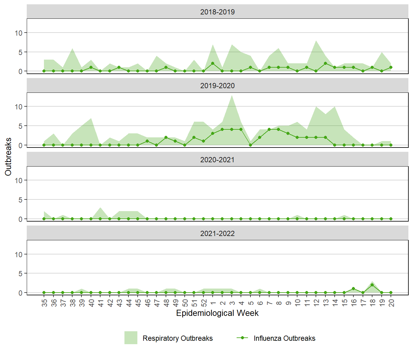 BackFigure 3. Weekly Respiratory and Influenza Outbreaks, Manitoba, 2018 – May 21, 2022
