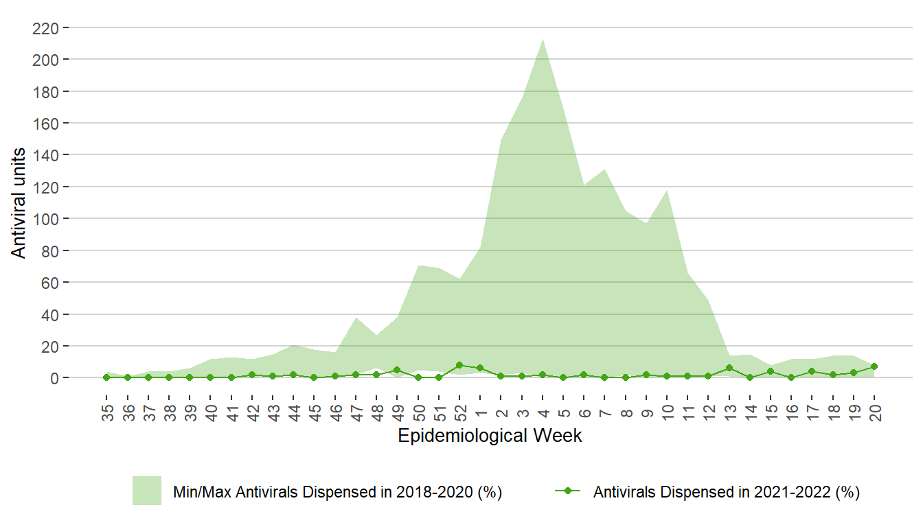 Figure 6. Weekly Units of Antiviral Dispensed from Pharmacies, Manitoba, 2018 – May 21, 2022