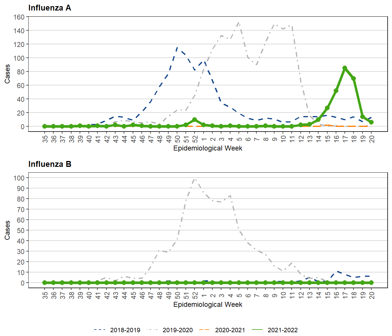 Figure 1. Weekly Cases of Laboratory-Confirmed Influenza, Manitoba, 2018 – May 21, 2022
