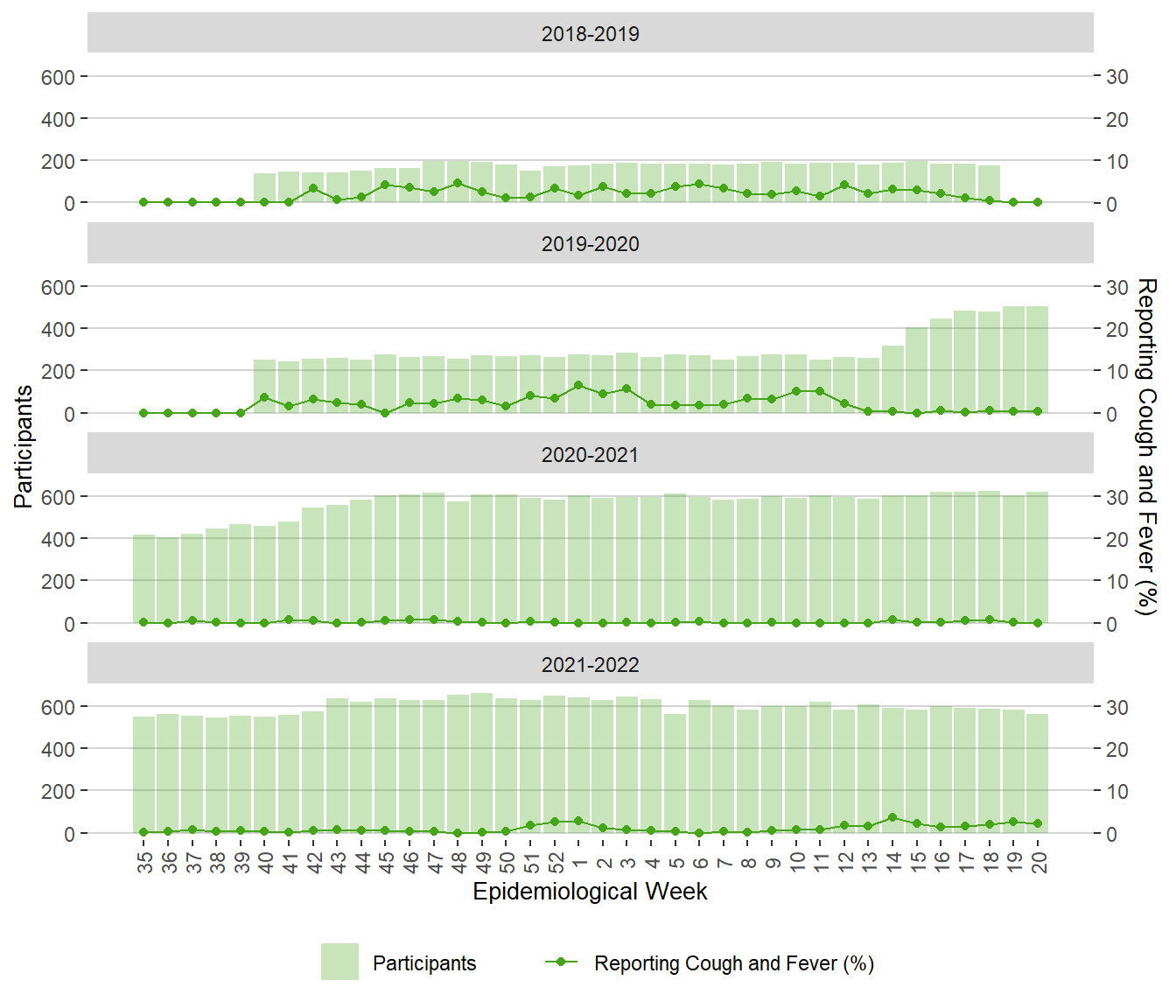 Figure 4. Weekly FluWatchers Participants and Percentage Reporting Fever and Cough, Manitoba, 2018 – May 21, 2022