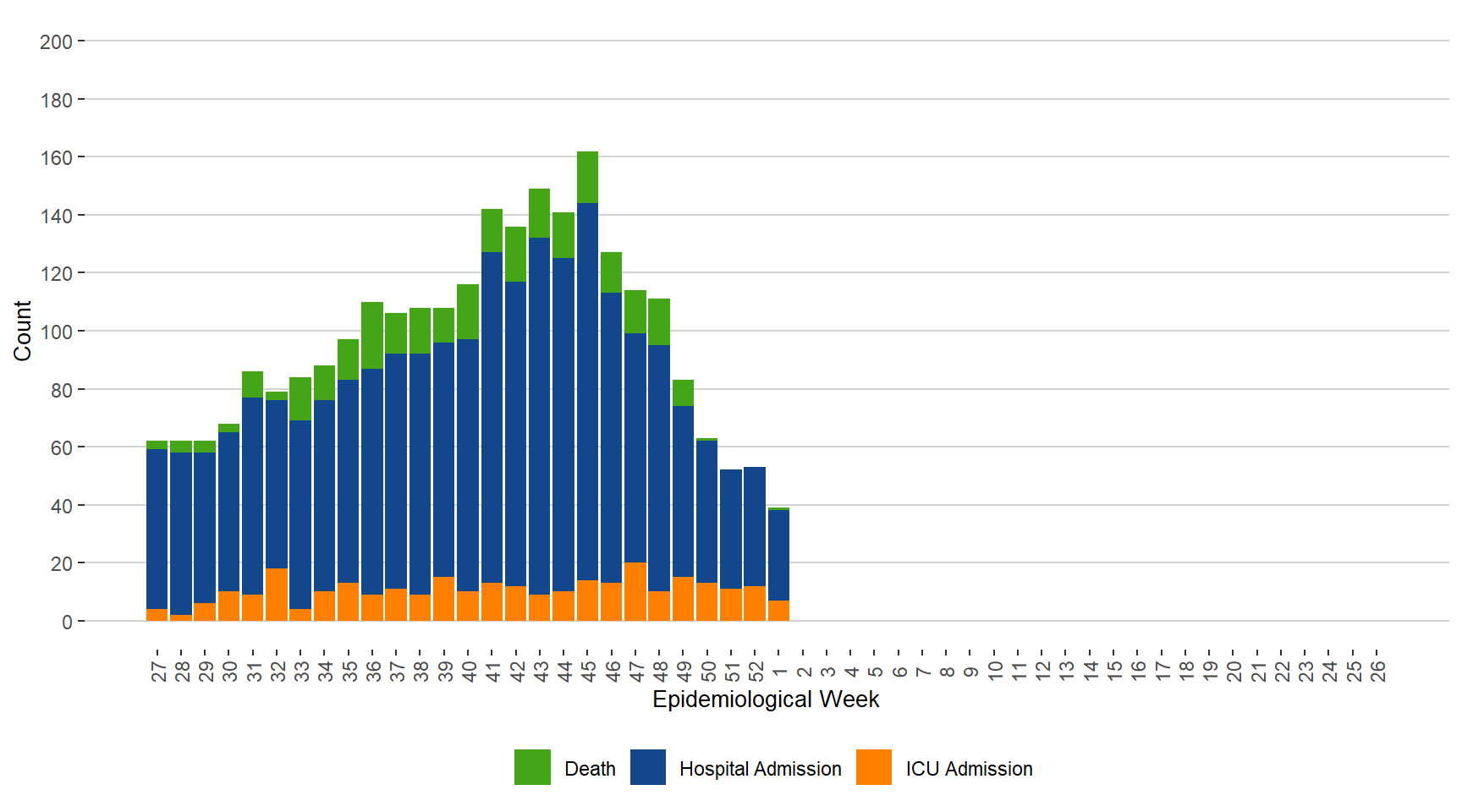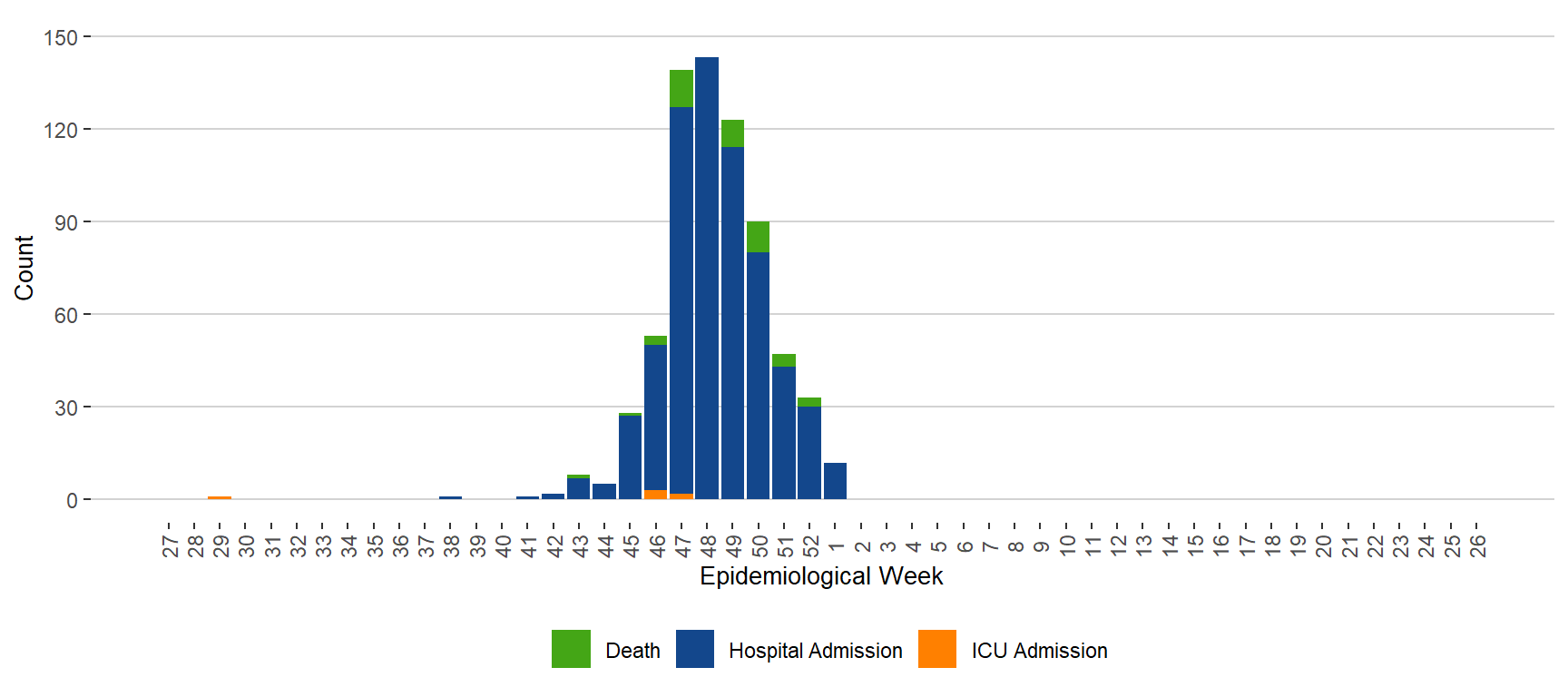 BackFigure 13. Severe Outcomes of Influenza by Week of Outcome Date, Manitoba, July 3, 2022 – January 7, 2022