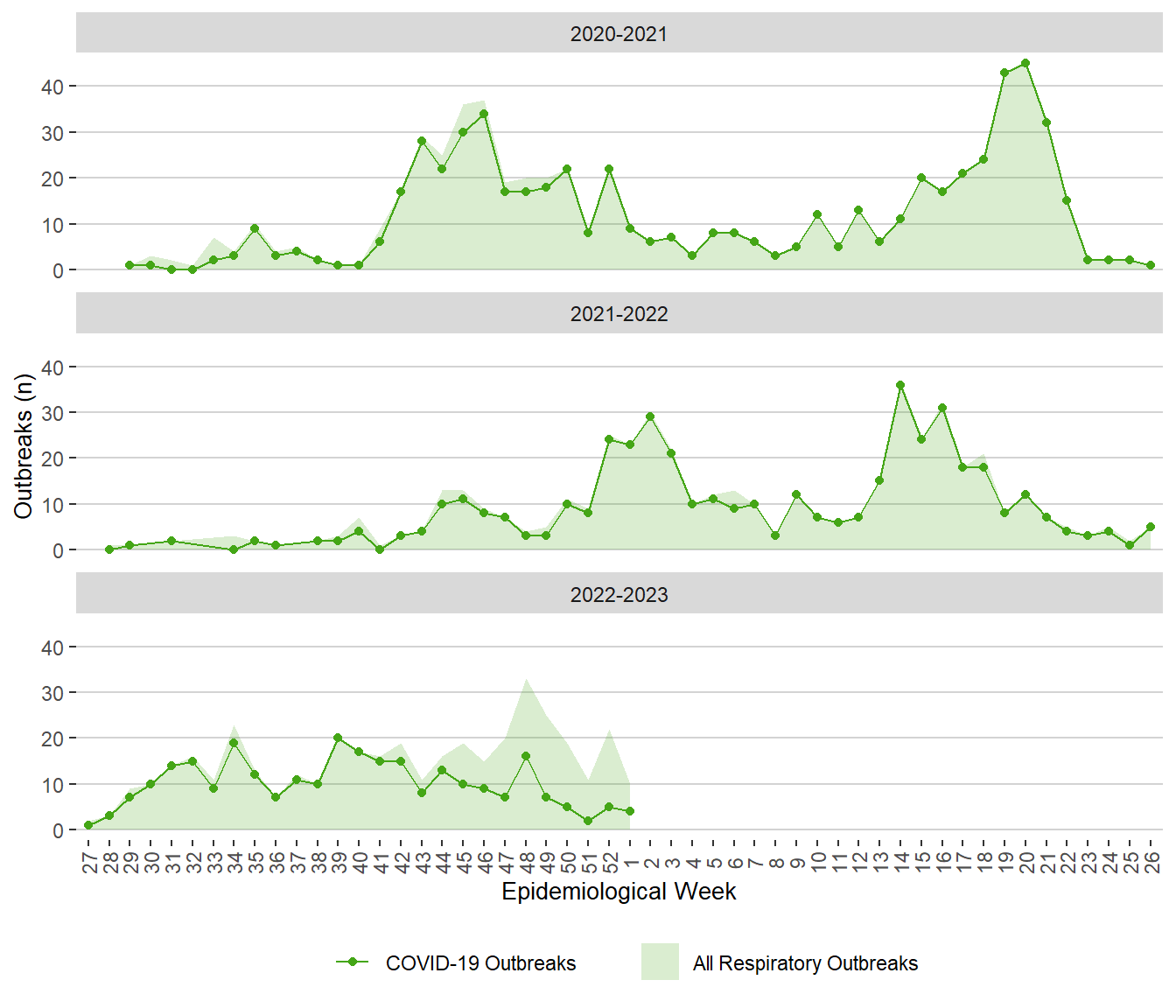 Note: All respiratory outbreaks include COVID-19 outbreaks, influenza outbreaks and the other respiratory outbreaks with known or unknown pathogens.