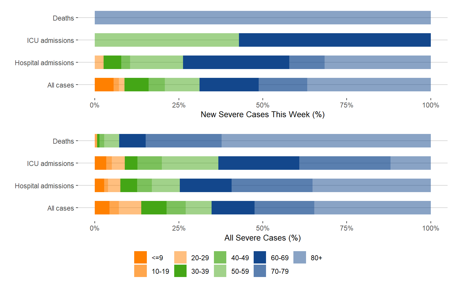 Figure 7. Age Distribution of Severe COVID-19 Cases This Week Compared to All Cases, Manitoba, July 3, 2022 – January 7, 2022