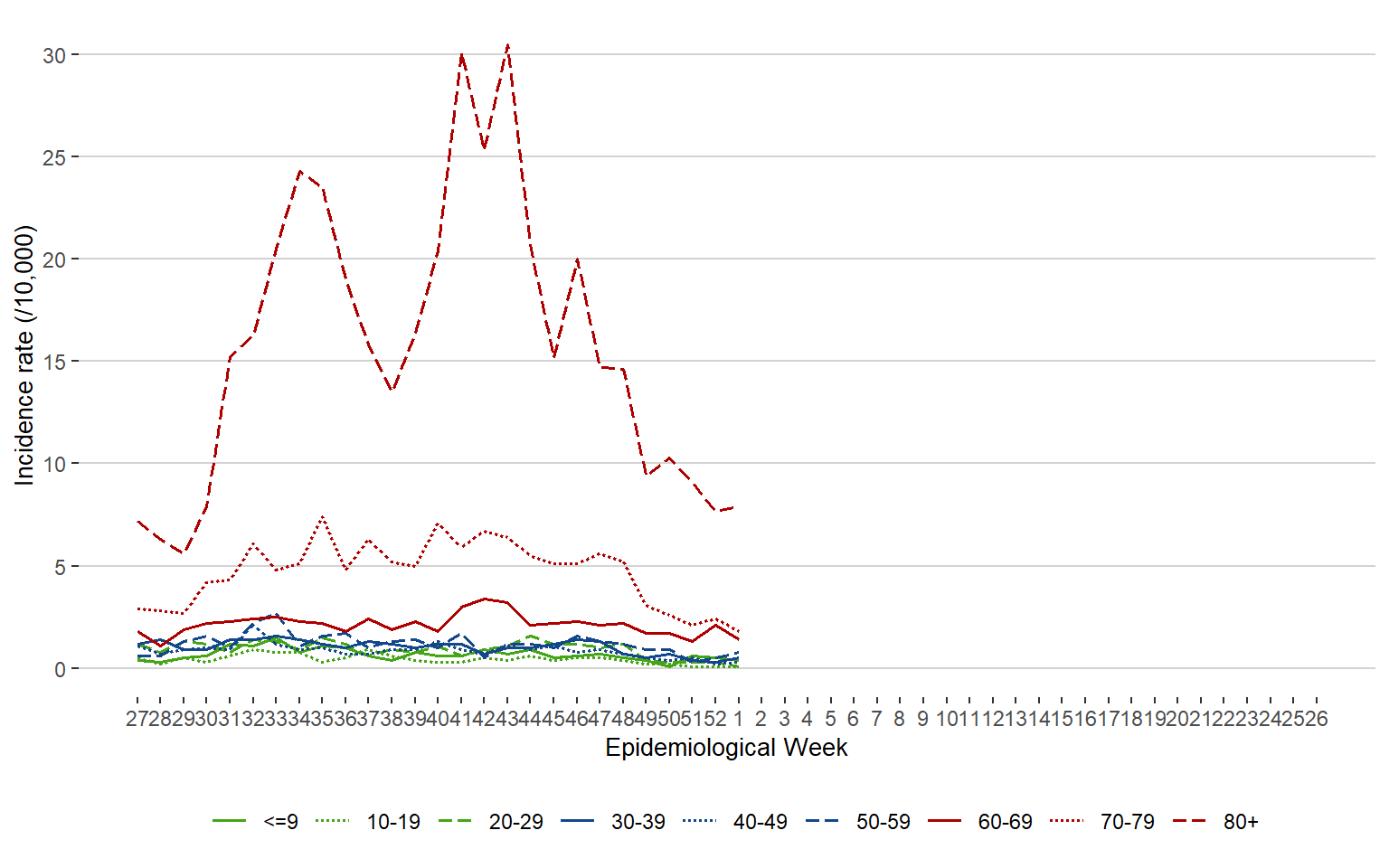 Figure 3. Incidence Rate (/10,000 Population) of COVID-19 Cases by Age Group and Week of Public Health Report Date, Manitoba, July 3, 2022 – January 7, 2022