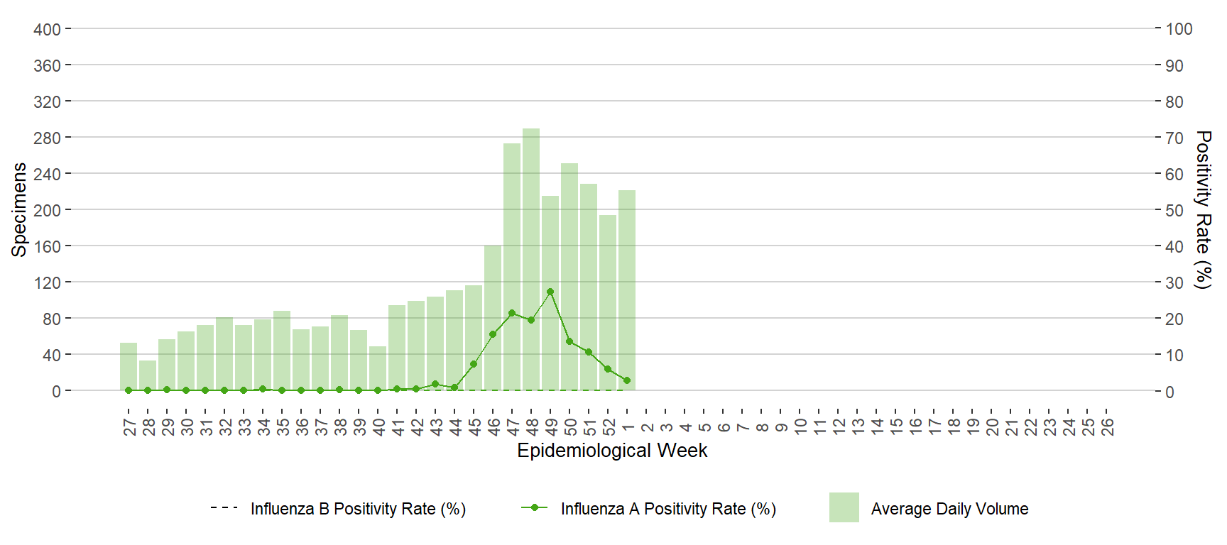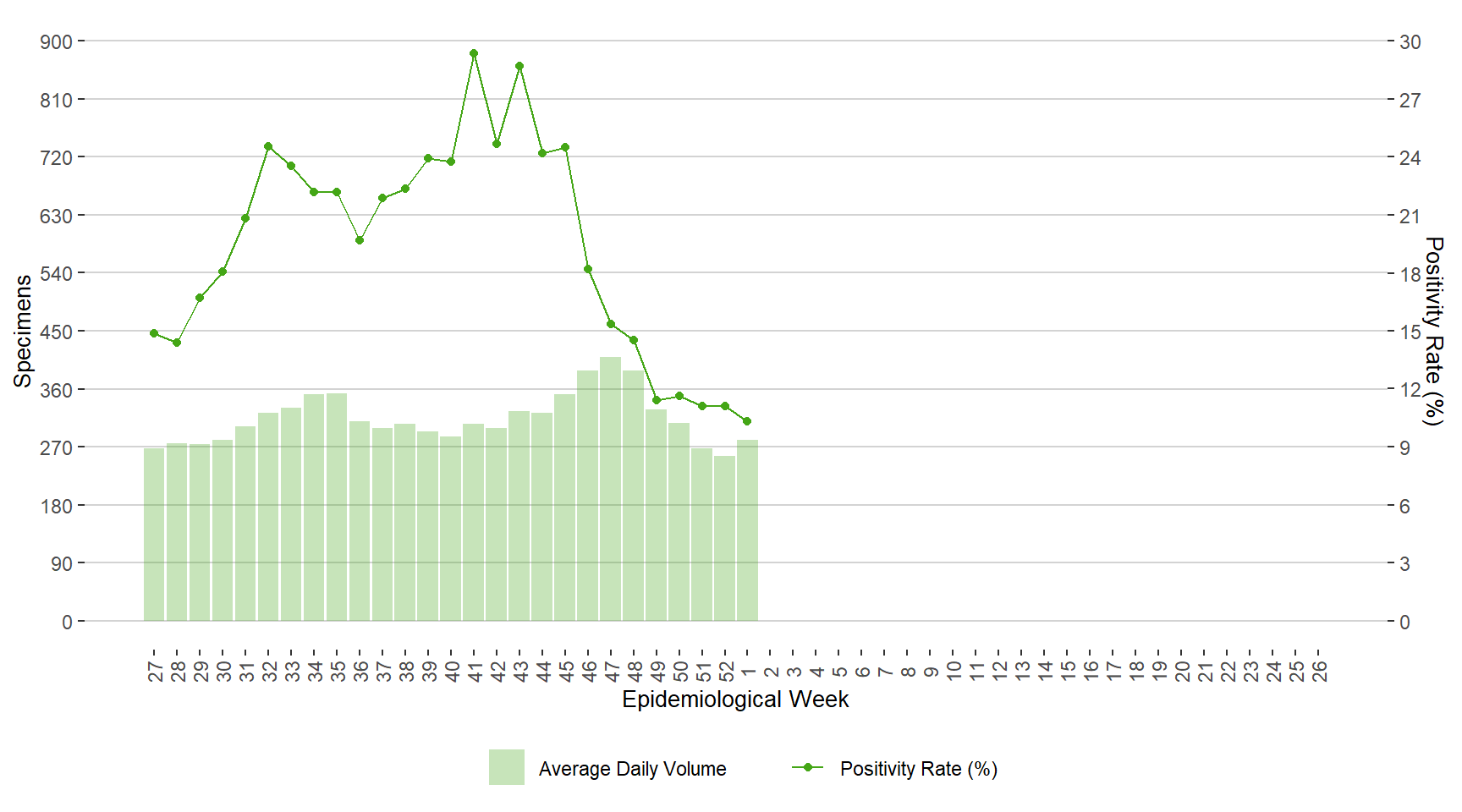 BackFigure 11. Average Daily Testing Volume and Positivity (%) for Influenza by Week of Specimen Receiving Date, Manitoba, July 3, 2022 – January 7, 2022