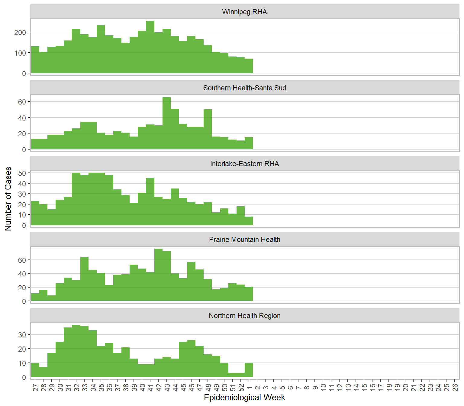 This weekly report provides a current epidemiological update on the intensity and severity of respiratory activity in Manitoba including laboratory confirmed activity of both COVID-19 and seasonal influenza. Surveillance data include syndromic indicators, laboratory testing, associated hospitalization and mortality, and outbreaks. Updates around immunization coverage in COVID-19 and seasonal influenza are also included.