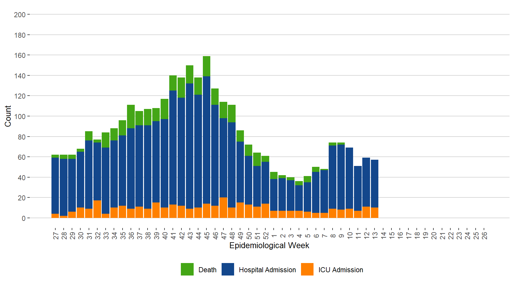 BackFigure 13. Severe Outcomes of Influenza by Week of Outcome Date, Manitoba, July 3, 2022 – April 1, 2023