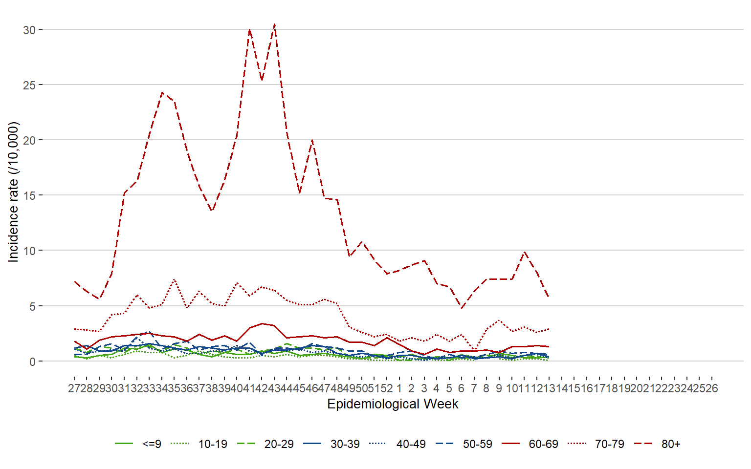 Figure 10. Incidence Rate (/10,000 Population) of Influenza Cases by Age Group and Week of Public Health Report Date, July 3, 2022 – April 1, 2023