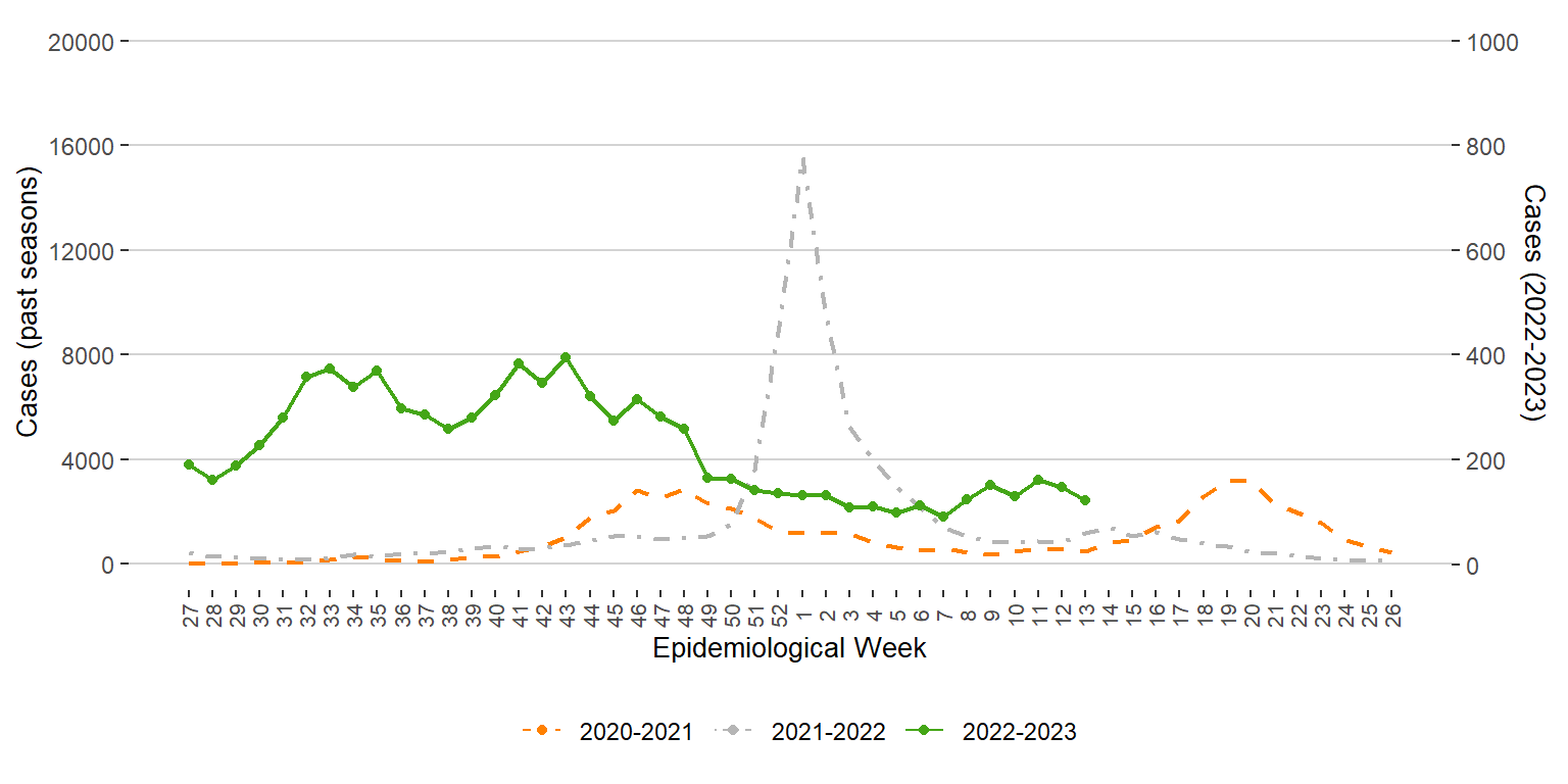 Figure 9. Weekly Cases of Influenza by Season, Manitoba, 2019 – 2023 (July through June)