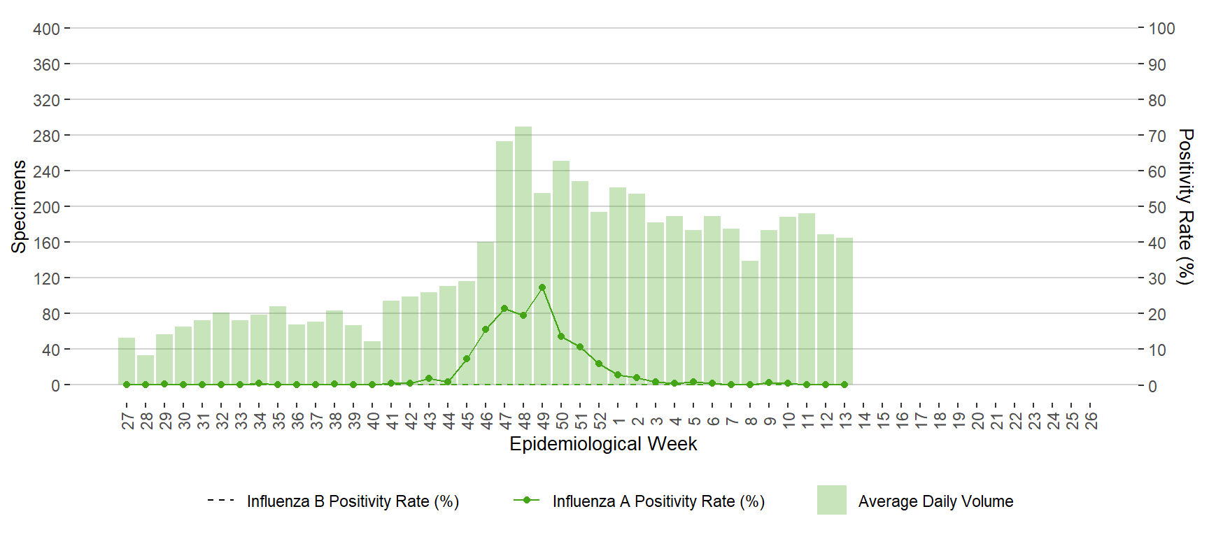 BackFigure 11. Average Daily Testing Volume and Positivity (%) for Influenza by Week of Specimen Receiving Date, Manitoba, July 3, 2022 – April 1, 2023