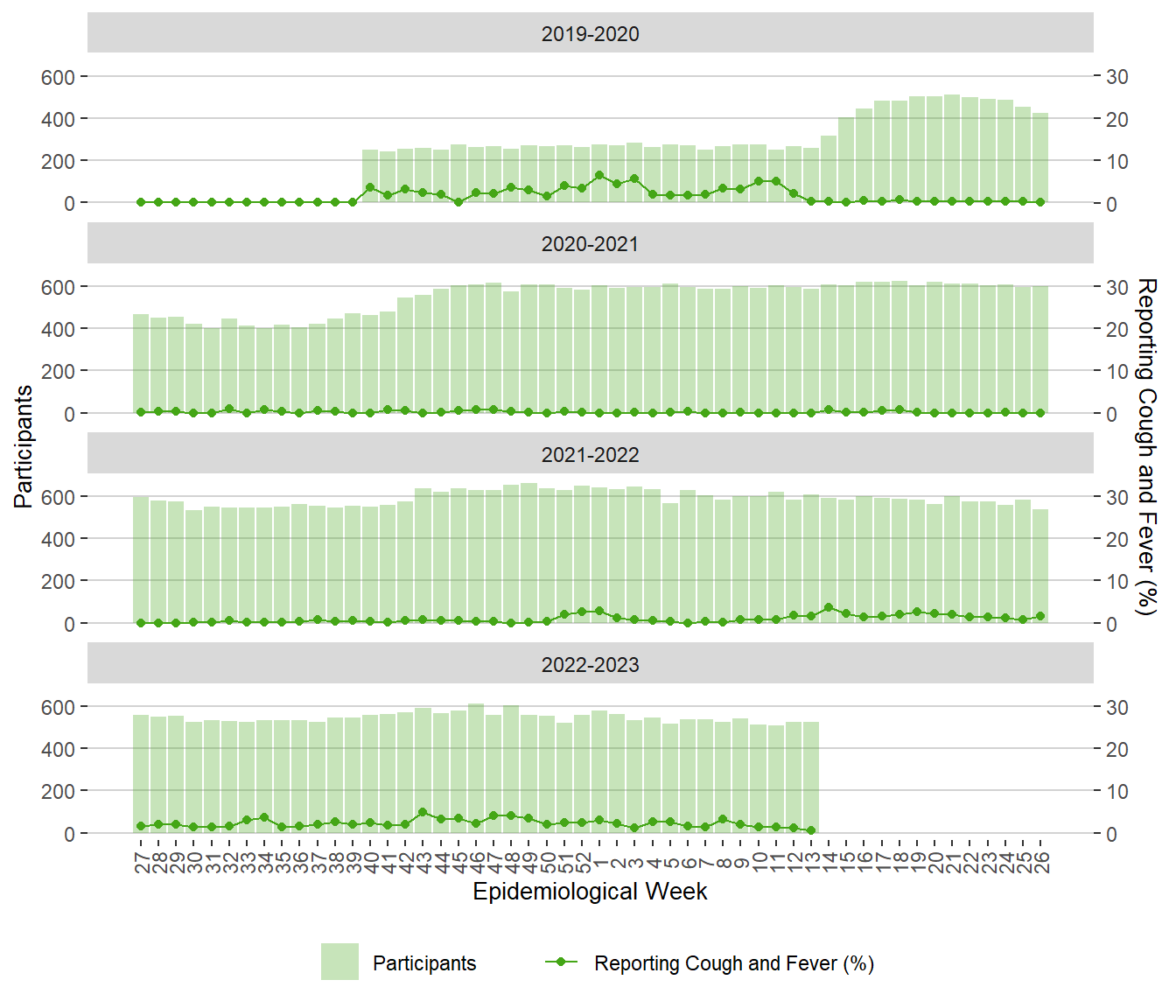 Figure 16. Weekly FluWatchers Participants and Percentage Reporting Fever and Cough, Manitoba, 2019 – April 1, 2023