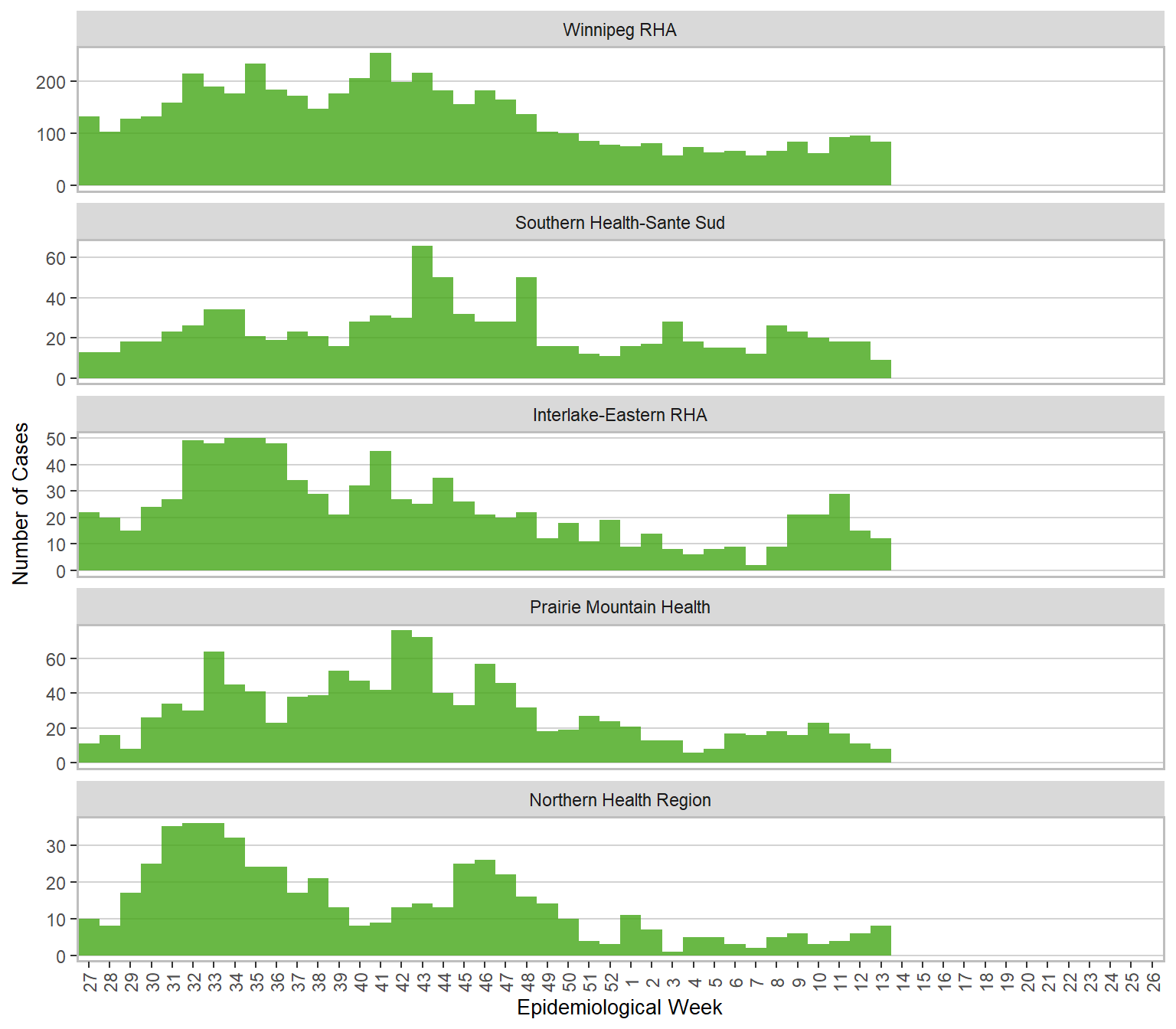 Figure 4. Cases of COVID-19 by Health Region and Public Health Report Date, Manitoba, July 3, 2022 – April 1, 2023