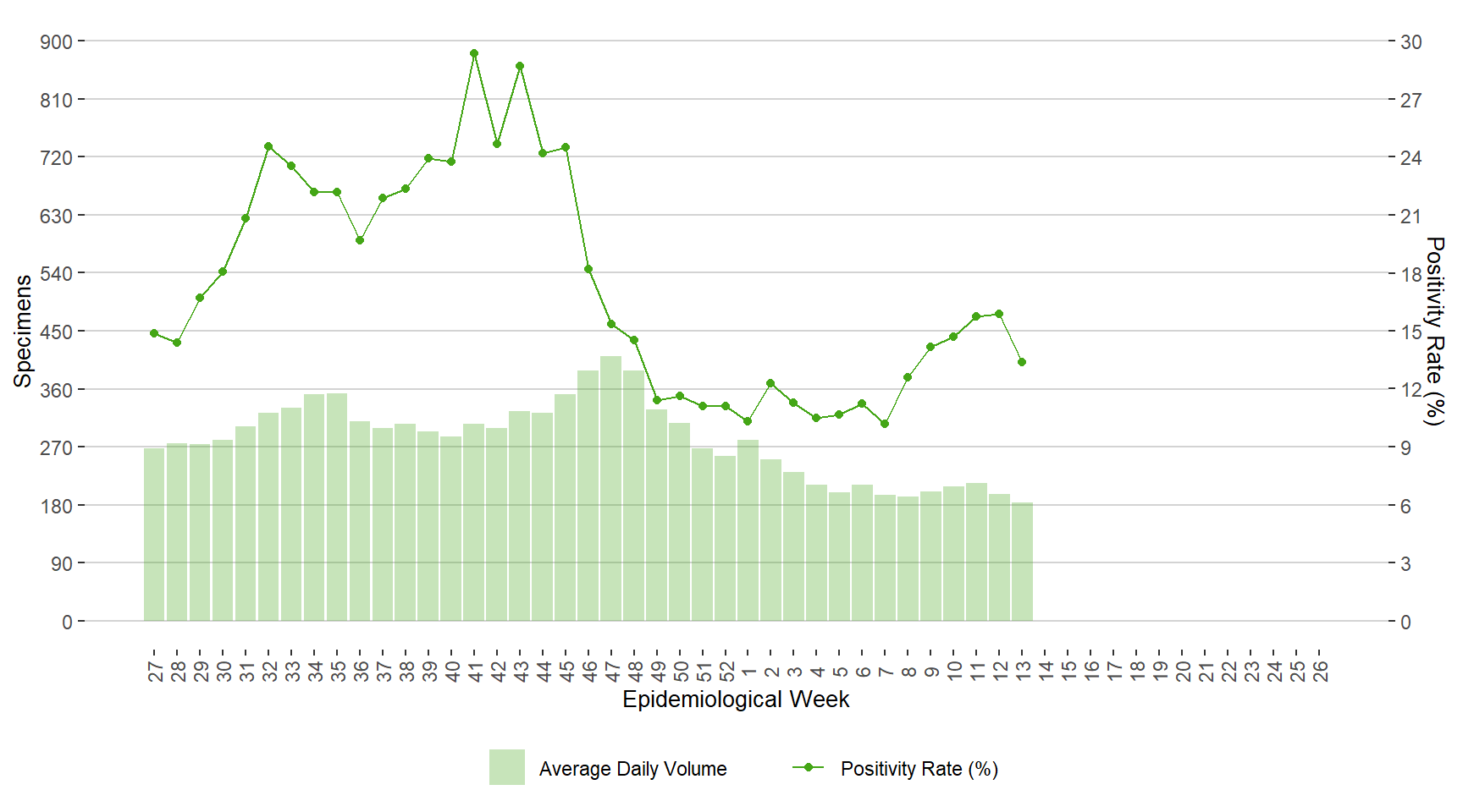 Figure 5. Average Daily Testing Volume and Positivity (%) for COVID-19 by Week of Specimen Receiving Date, Manitoba, July 3, 2022 – April 1, 2023