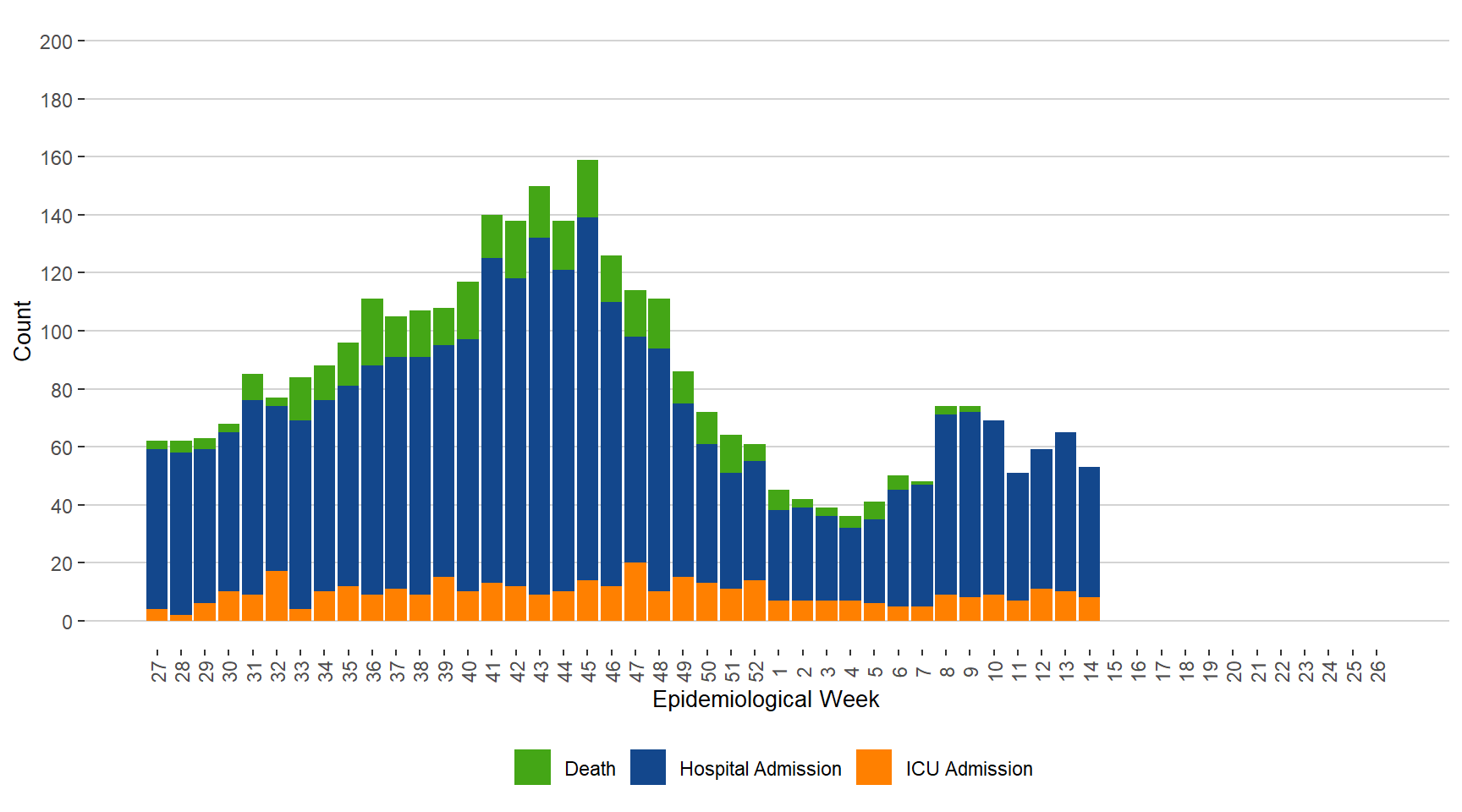 BackFigure 13. Severe Outcomes of Influenza by Week of Outcome Date, Manitoba, July 3, 2022 – April 8, 2023
