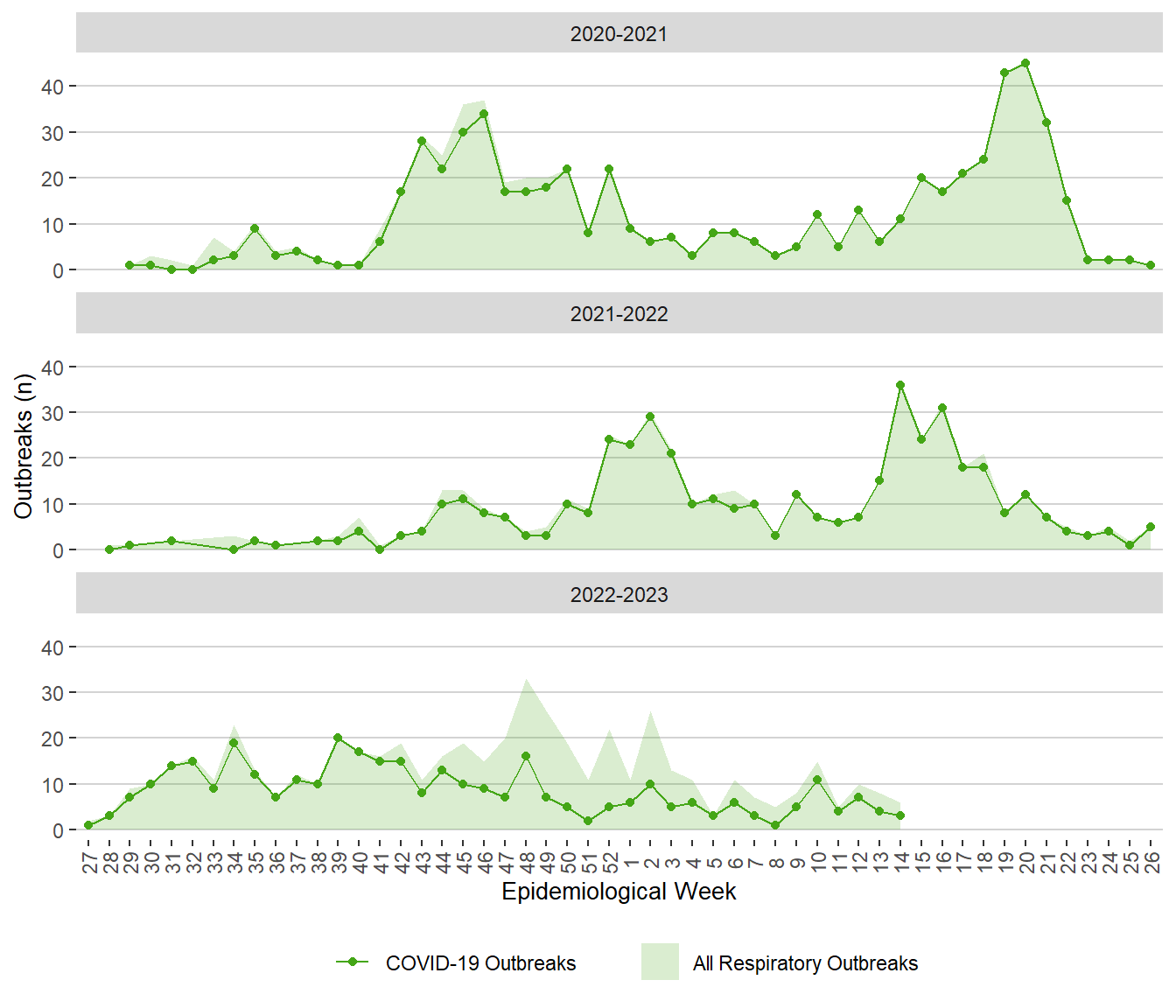 Note: All respiratory outbreaks include COVID-19 outbreaks, influenza outbreaks and the other respiratory outbreaks with known or unknown pathogens.