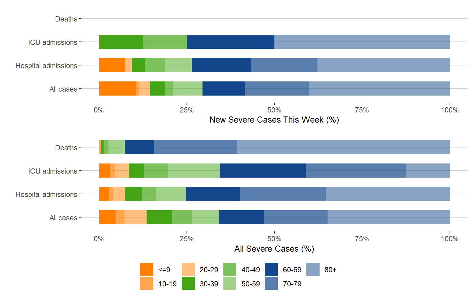 Figure 7. Age Distribution of Severe COVID-19 Cases This Week Compared to All Cases, Manitoba, July 3, 2022 – April 8, 2023