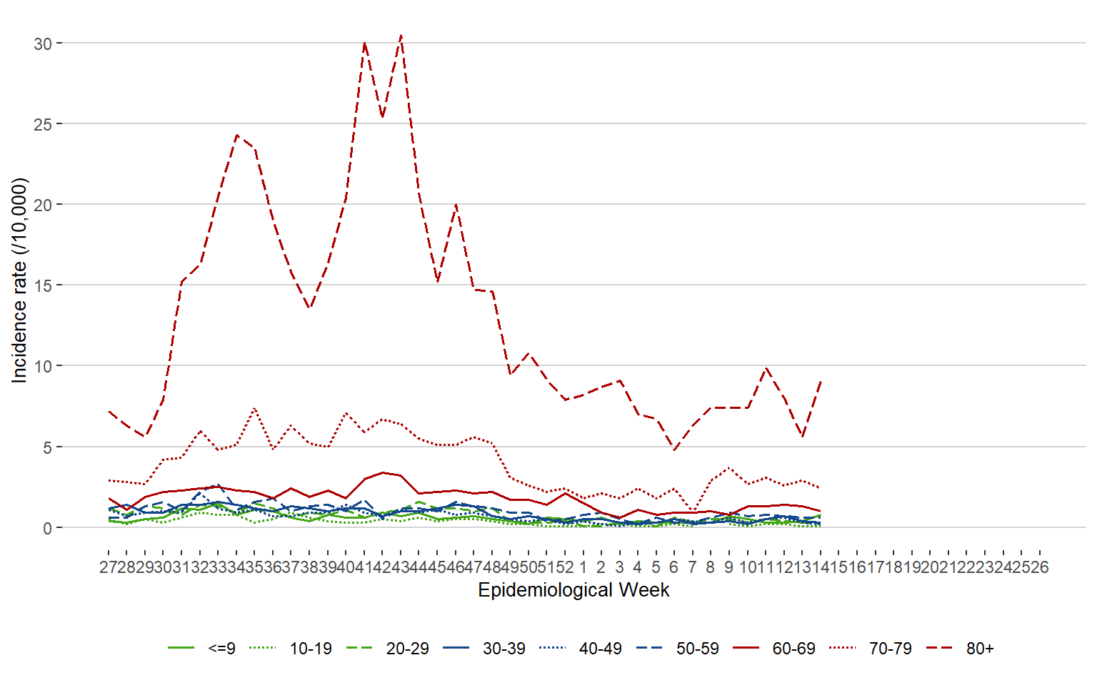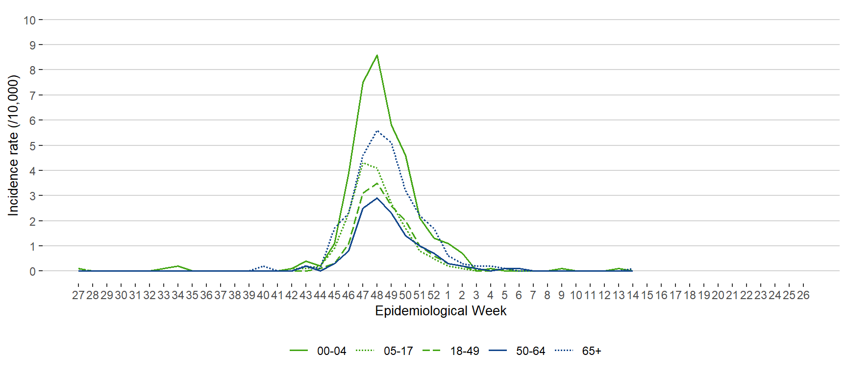 Figure 10. Incidence Rate (/10,000 Population) of Influenza Cases by Age Group and Week of Public Health Report Date, July 3, 2022 – April 8, 2023
