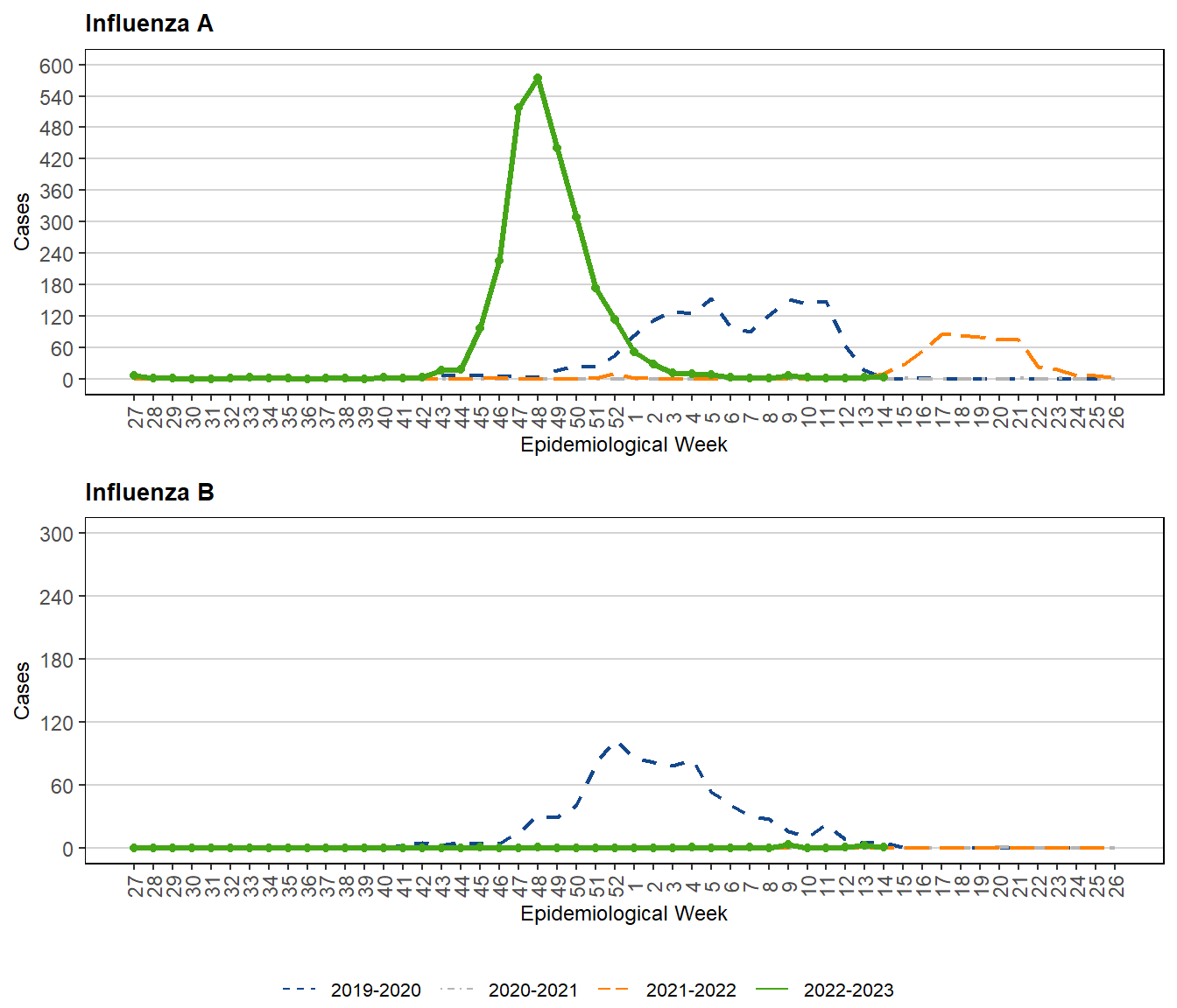 Figure 9. Weekly Cases of Influenza by Season, Manitoba, 2019 – 2023 (July through June)