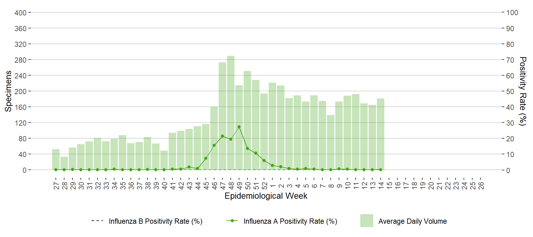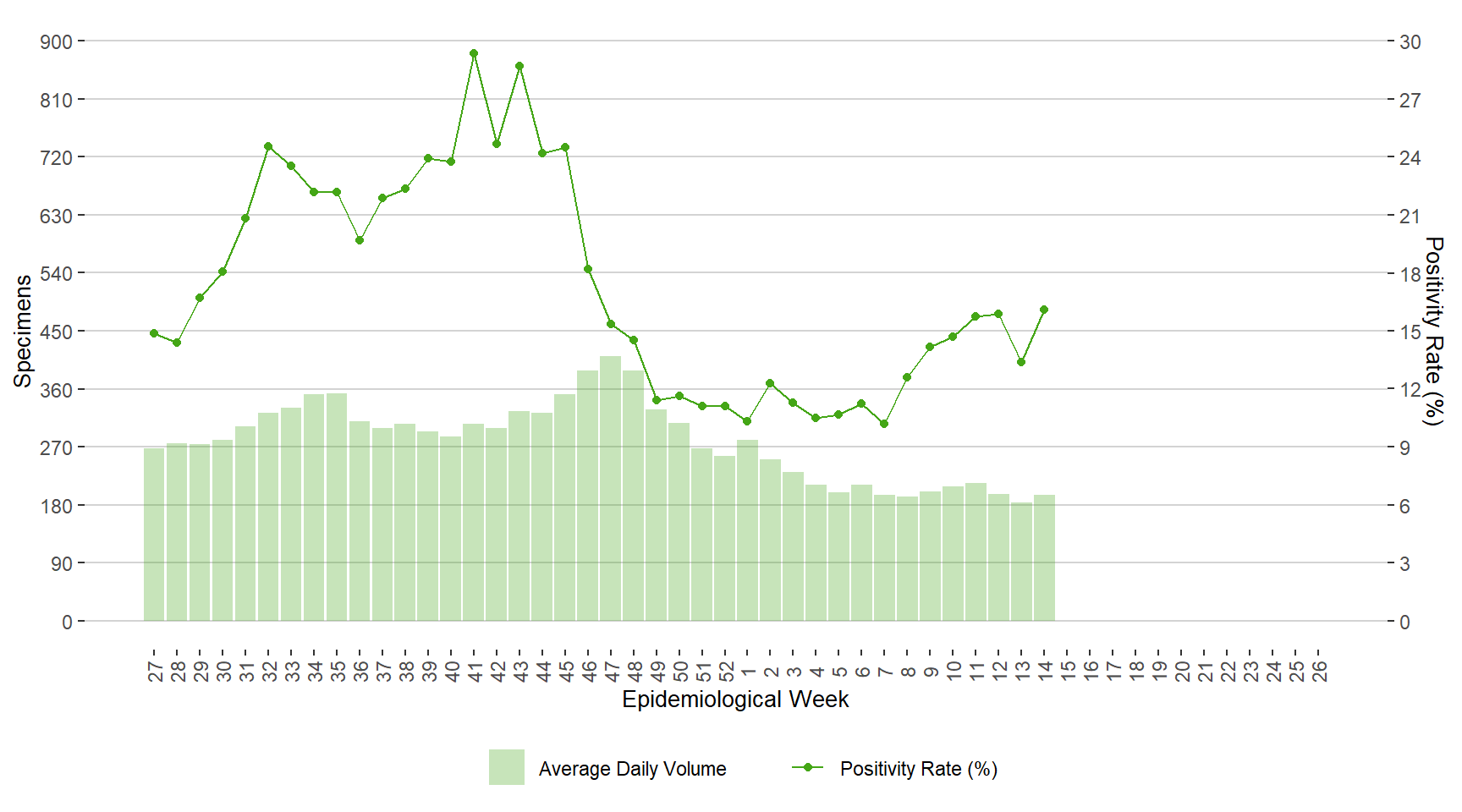 BackFigure 11. Average Daily Testing Volume and Positivity (%) for Influenza by Week of Specimen Receiving Date, Manitoba, July 3, 2022 – April 8, 2023