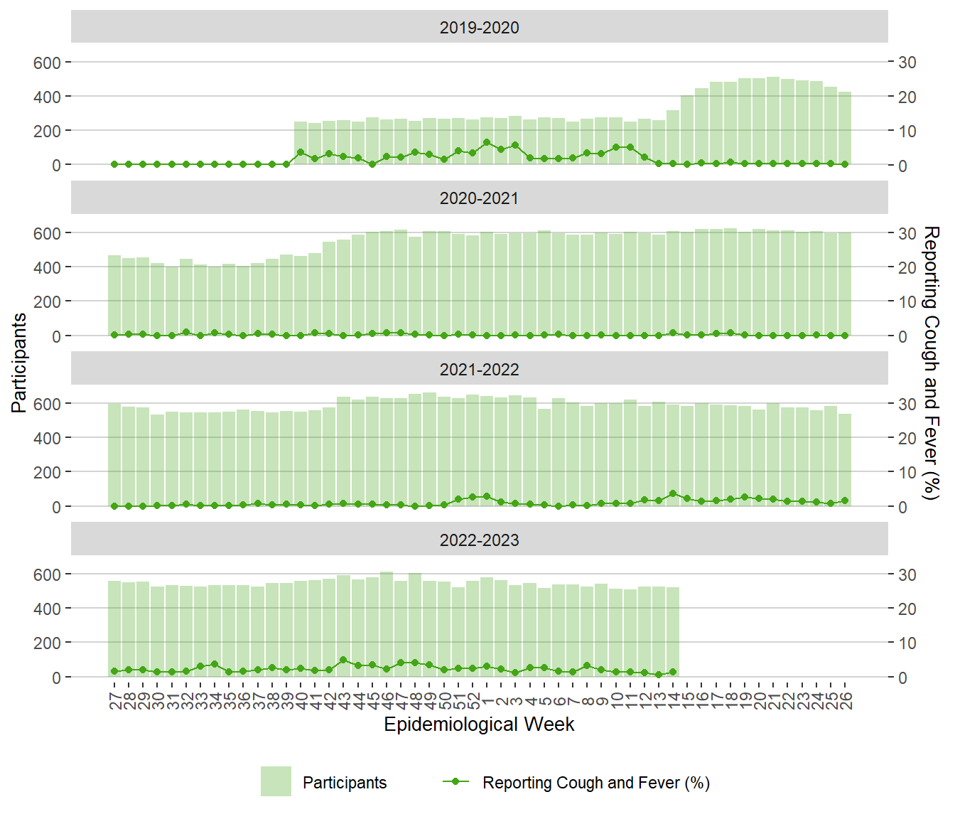 Figure 16. Weekly FluWatchers Participants and Percentage Reporting Fever and Cough, Manitoba, 2019 – April 8, 2023
