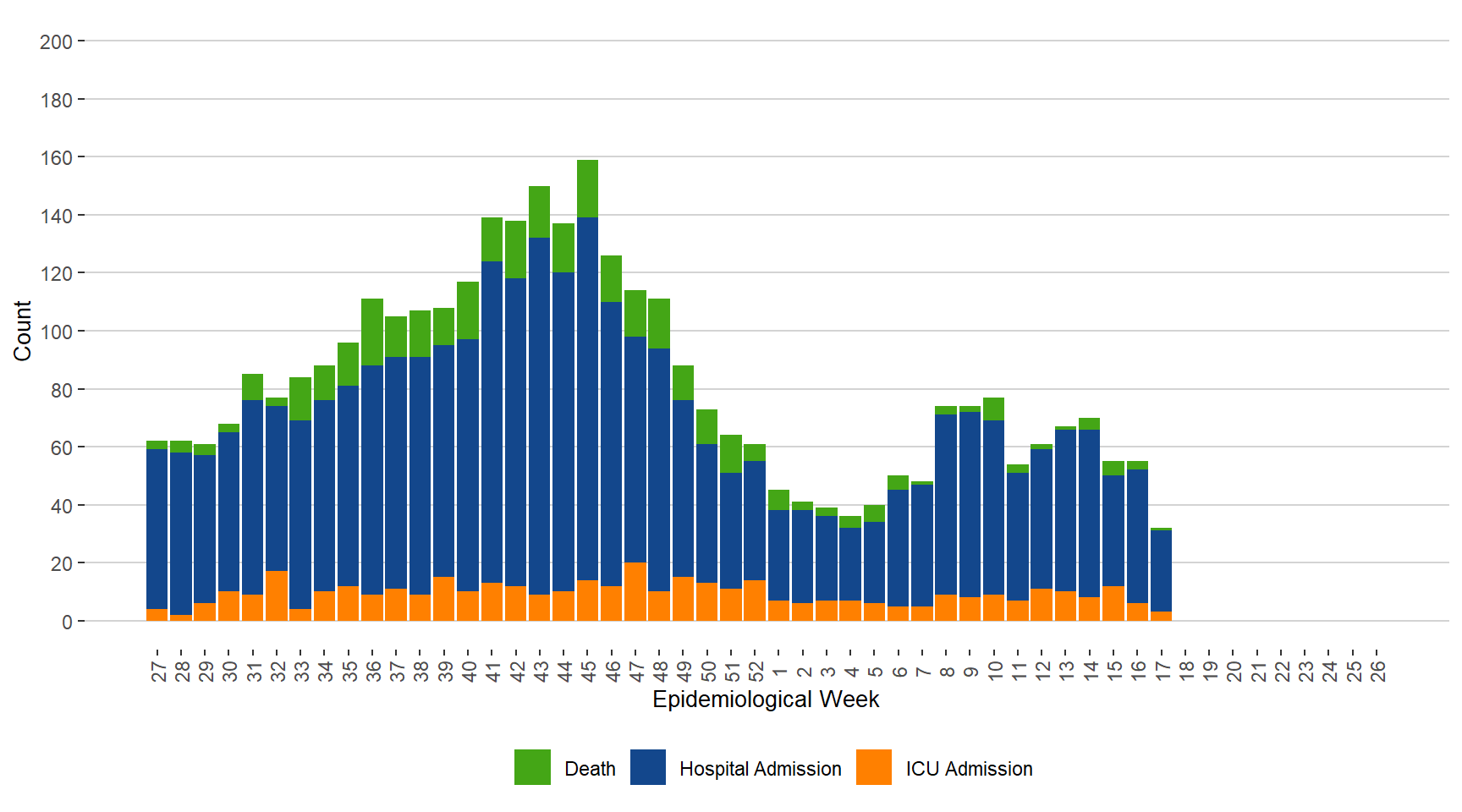 BackFigure 13. Severe Outcomes of Influenza by Week of Outcome Date, Manitoba, July 3, 2022 – April 29, 2023