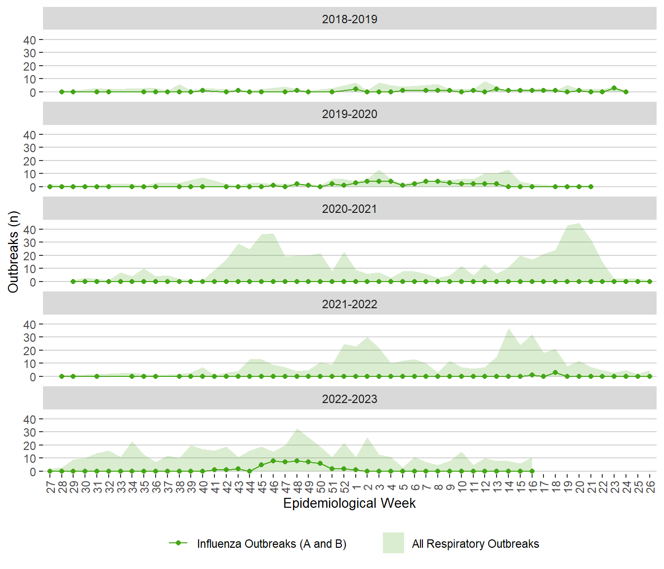Note: All respiratory outbreaks include COVID-19 outbreaks, influenza outbreaks and the other respiratory outbreaks with known or unknown pathogens.